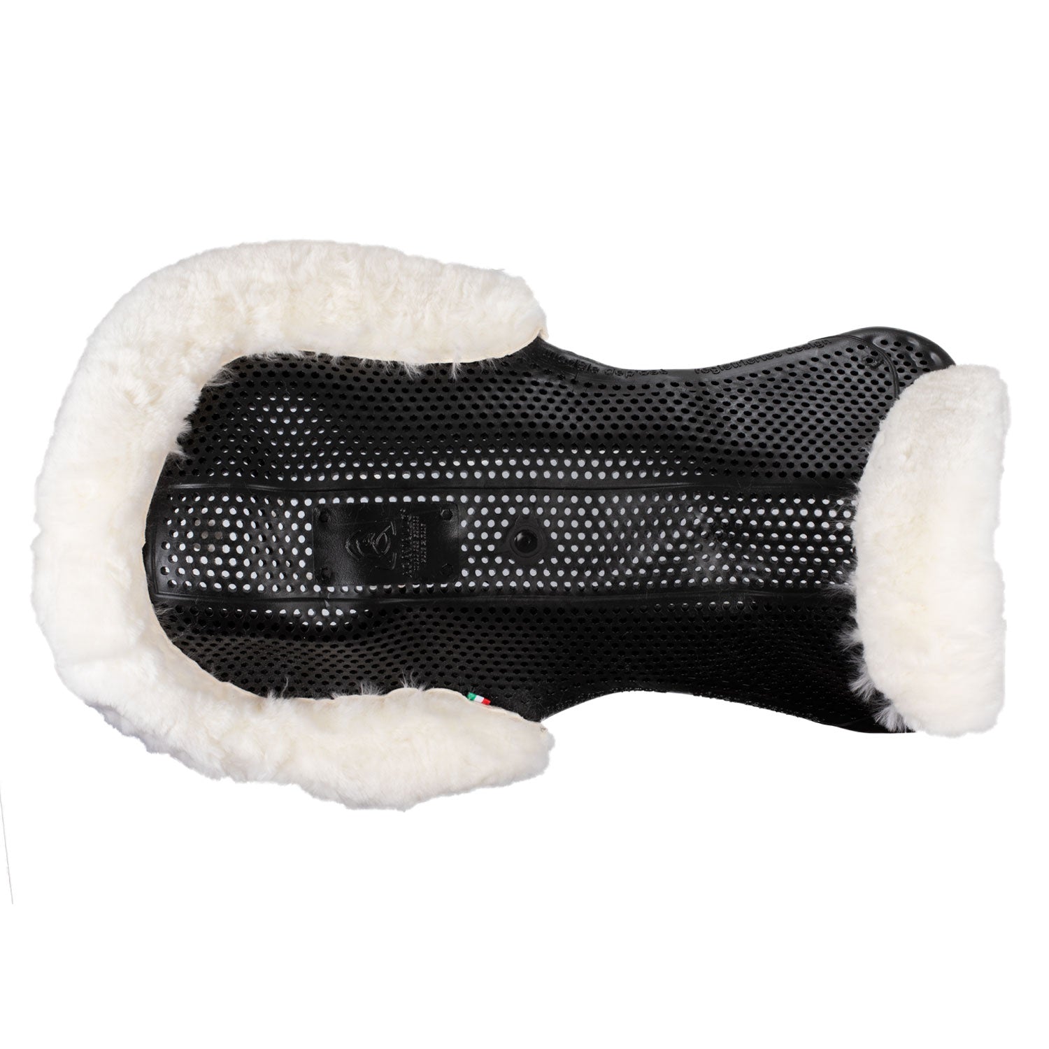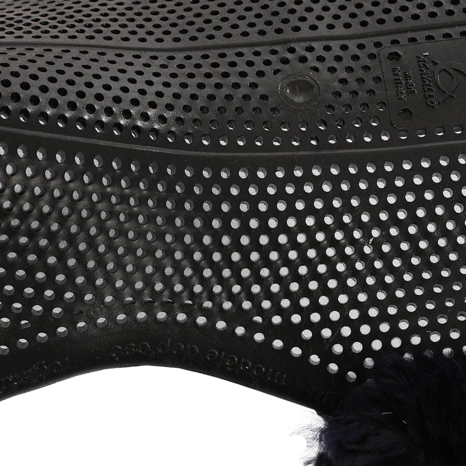La pelliccia selezionata da Acavallo® ha una densità di fibre per centimetro quadrato molto elevata, rendendola la migliore imbottitura emolliente naturale disponibile. Inoltre, il montone agisce come isolante al 100%, evitando l'emissione di cariche elettrostatiche a contatto con la pelle del cavallo. Altra caratteristica essenziale di questo materiale è la sua capacità di assorbire il sudore e rilasciarlo all'aria esterna sette volte più velocemente rispetto ai materiali sintetici.