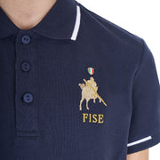 La polo è rifinita dal bordo a contrasto sia sulle maniche che sul colletto e la chiusura a tre bottoni ed è decorata con logo Equestro X FISE sul petto.
