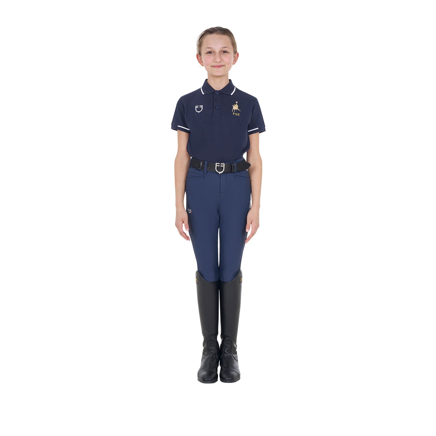 Polo bambini Equestro X FISE in tessuto tecnico super traspirante a manica corta, perfetta per la stagione estiva. L'innovativo tessuto con cui è realizzata è in grado di agevolare l'evaporazione e la dispersione del sudore mantenendo così il capo sempre asciutto e fresco.