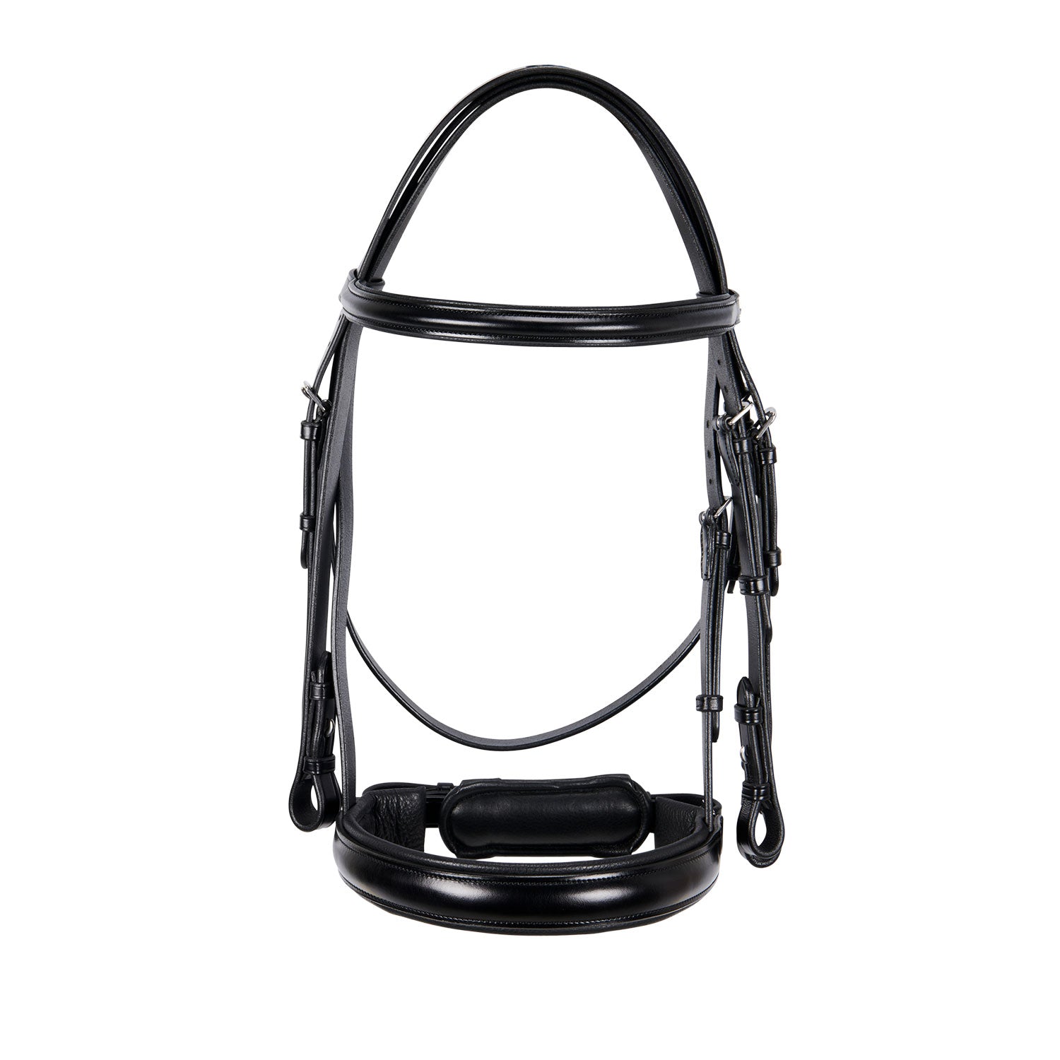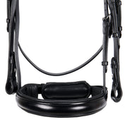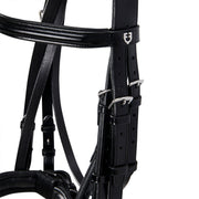 Briglia da dressage in morbido cuoio italiano, con fibbie in acciaio inox che gli conferiscono resistenza e stabilità per tutta la durata di utilizzo.