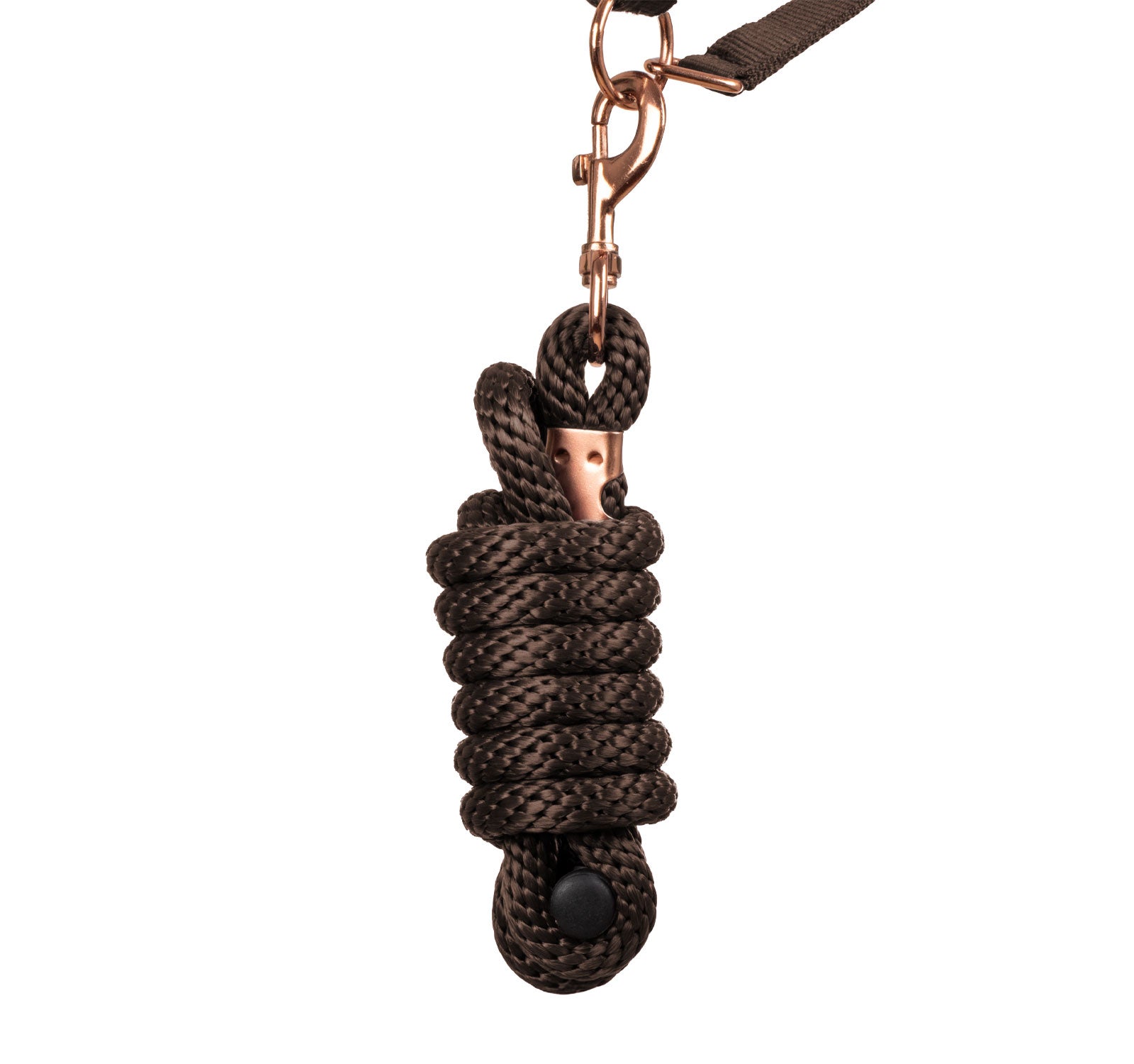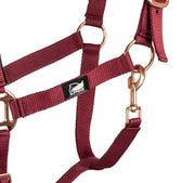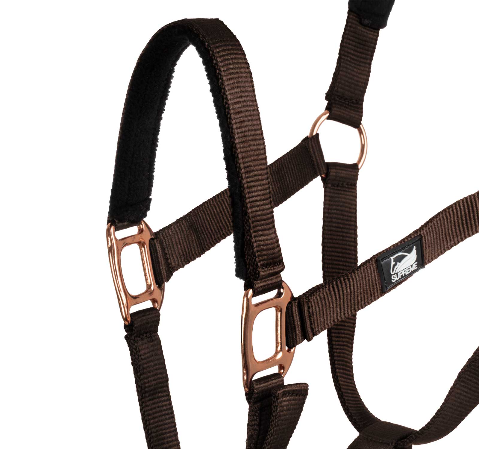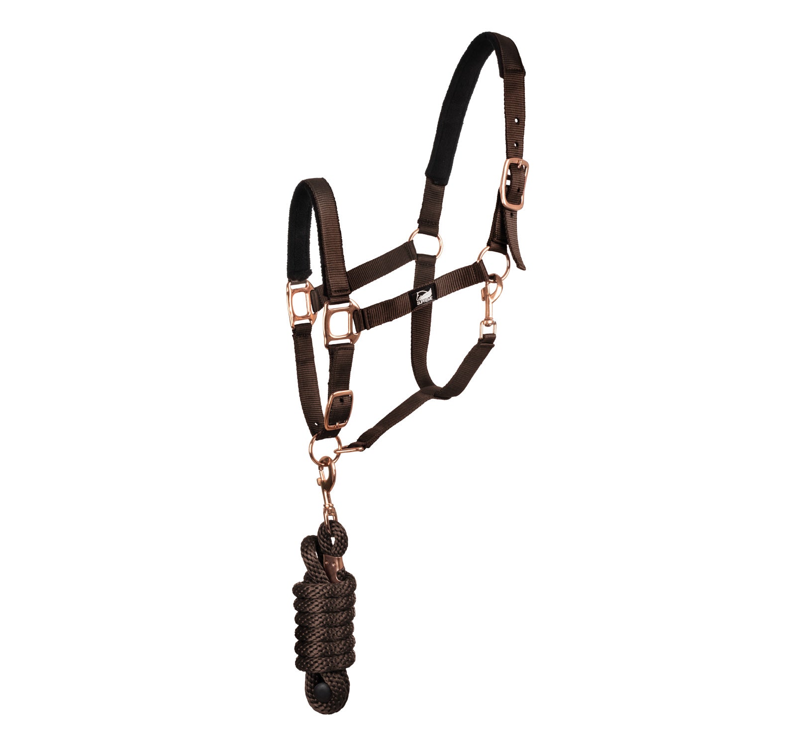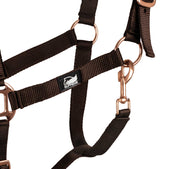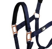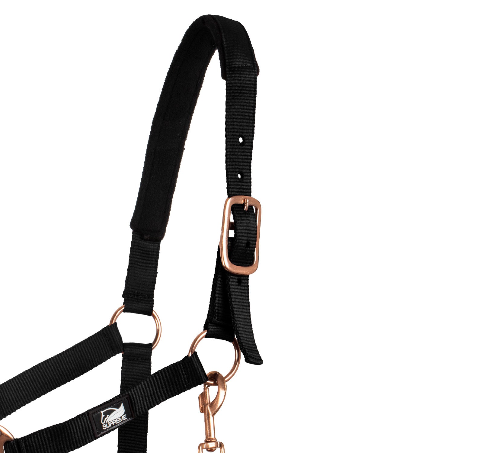 Cavezza nylon doppio con rinforzo in neoprene, fibbie cromate rose gold, doppia regolazione, completa con lunghina.