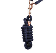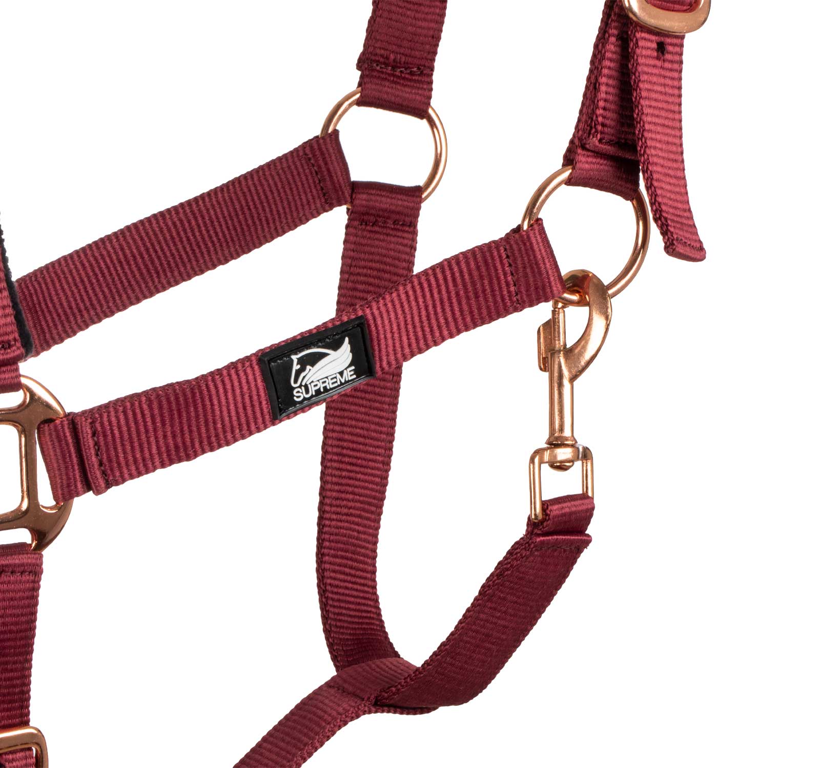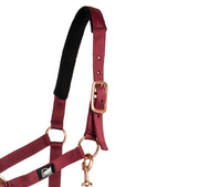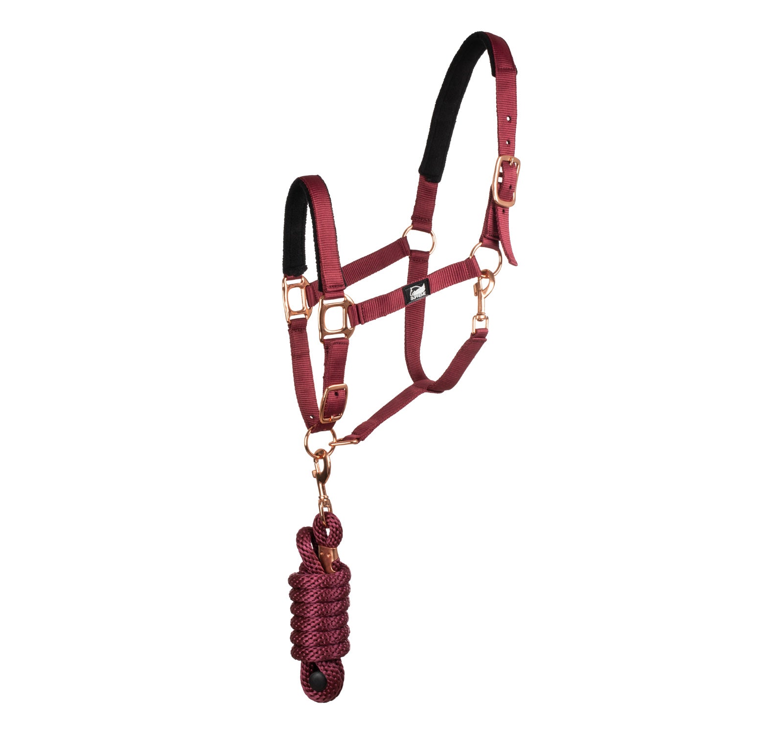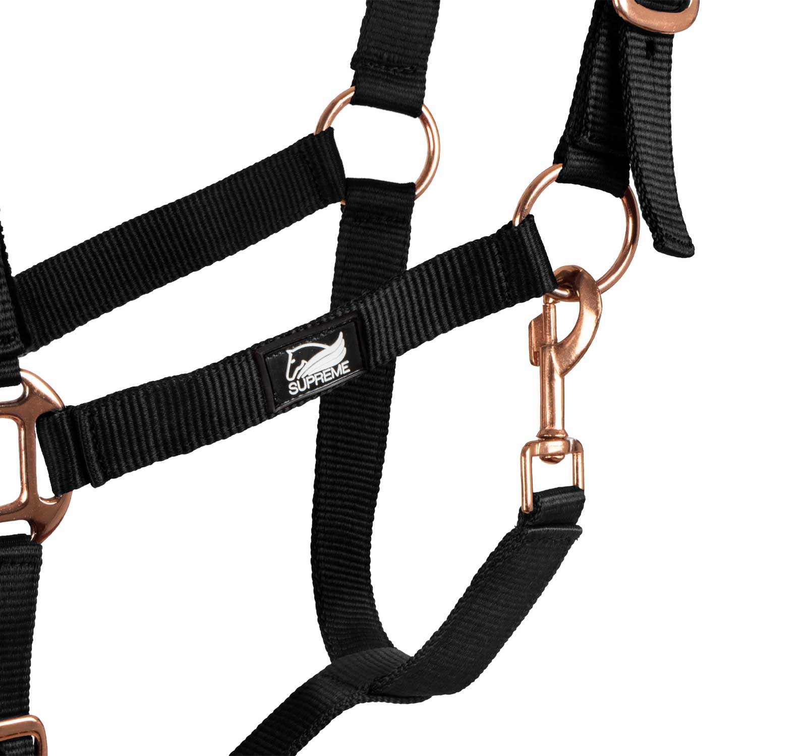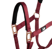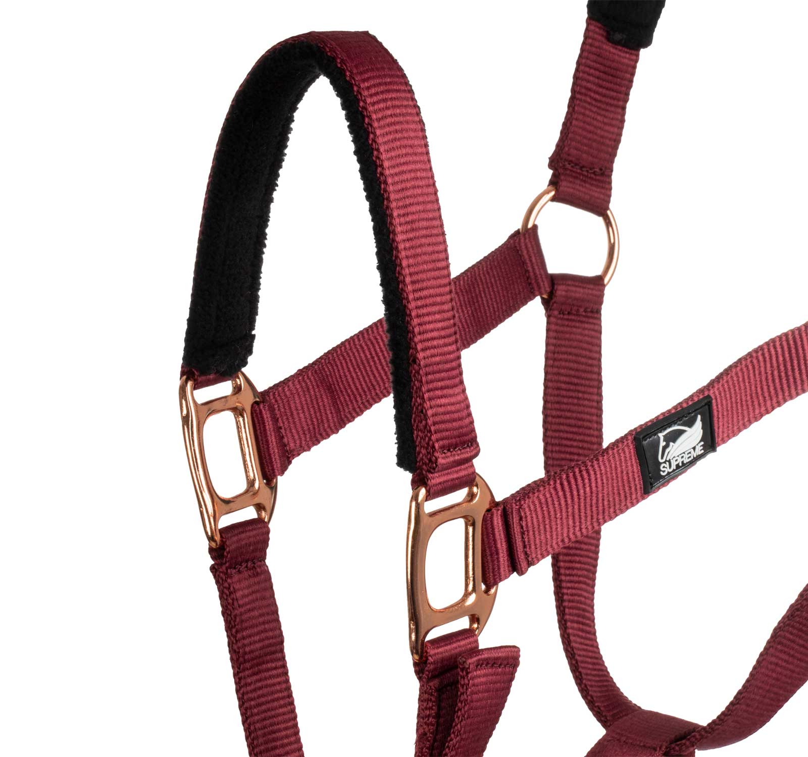 Cavezza nylon doppio con rinforzo in neoprene, fibbie cromate rose gold, doppia regolazione, completa con lunghina.