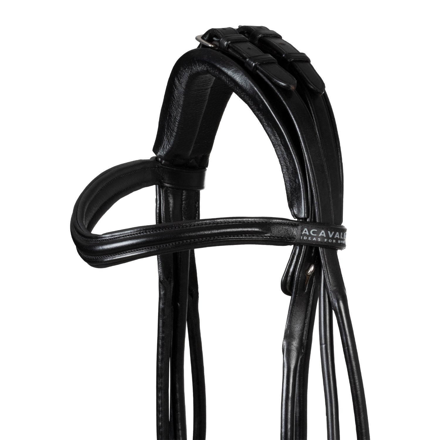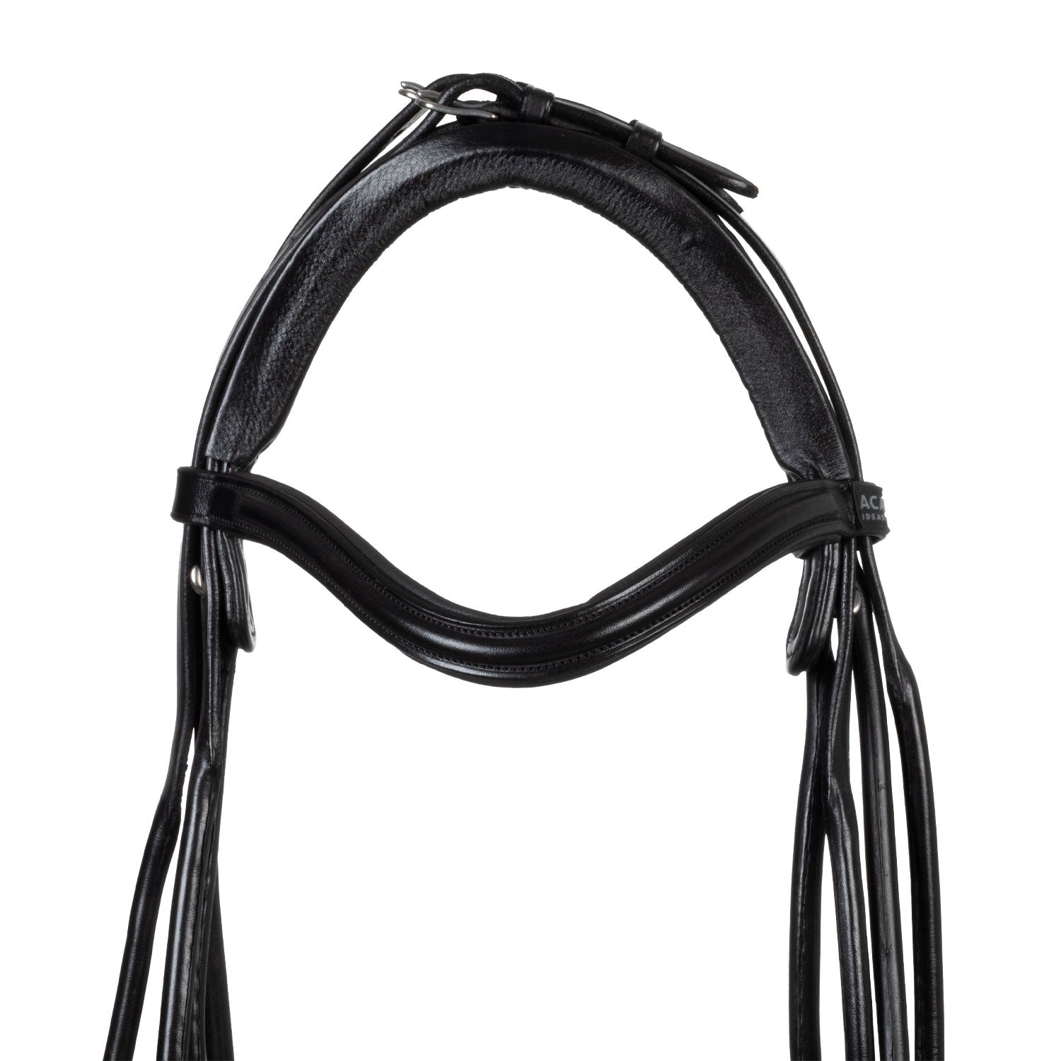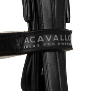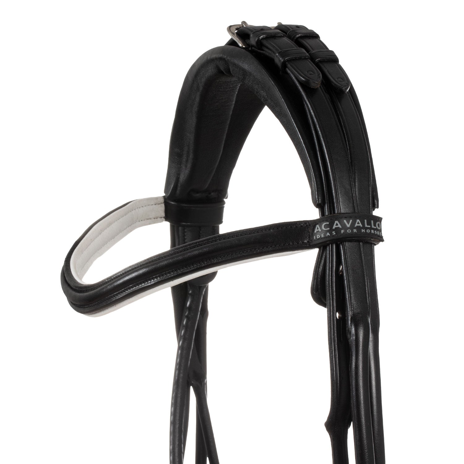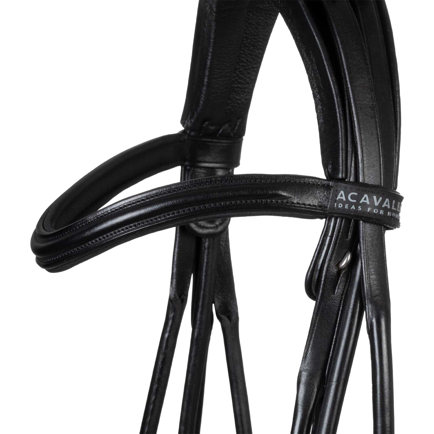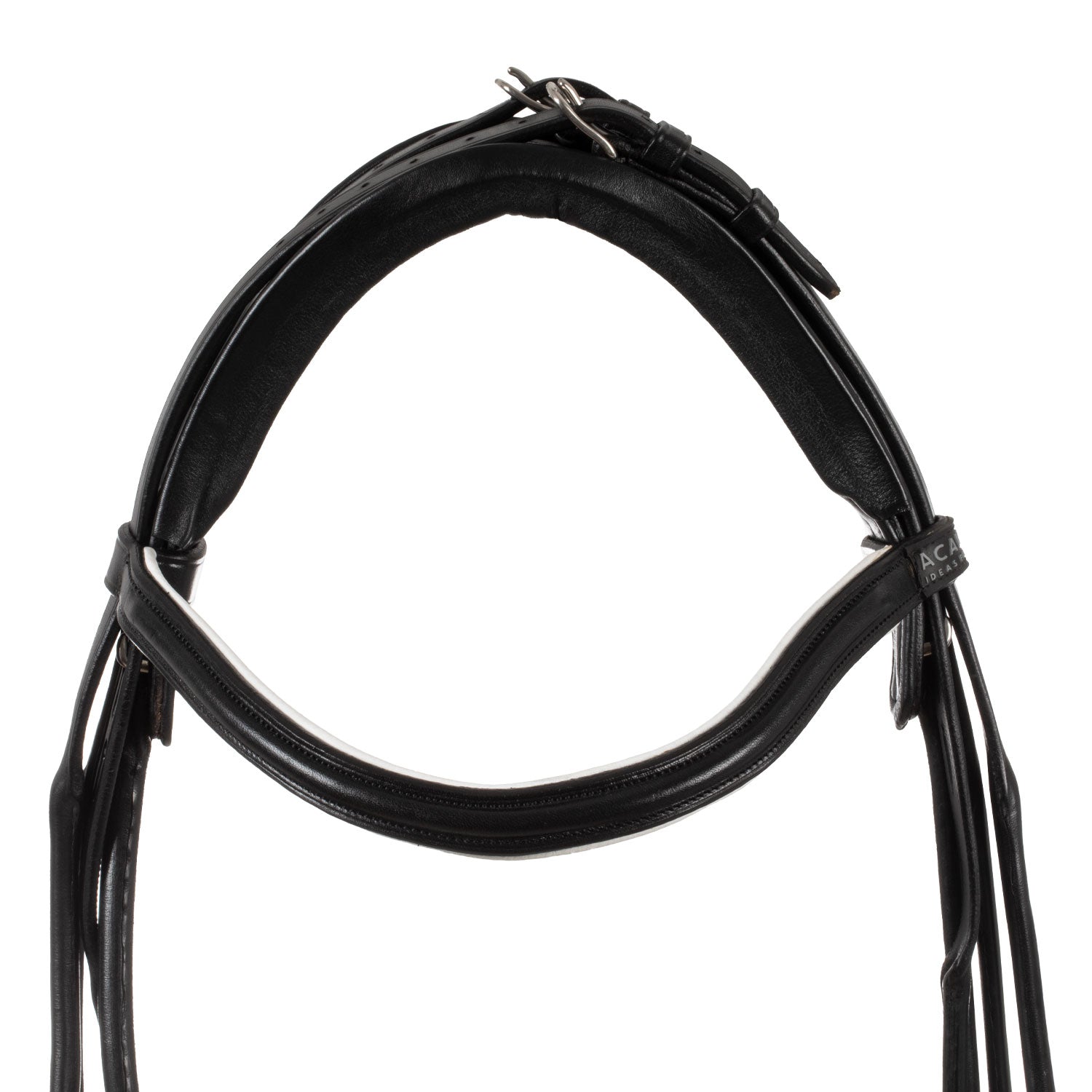 Il frontalino e il capezzino imbottito con piping bianco donano alla testiera un design ricercato, tipico dei prodotti Acavallo. La regolazione elegante si trova sul sovracapo, permettendoti di personalizzare la vestibilità.