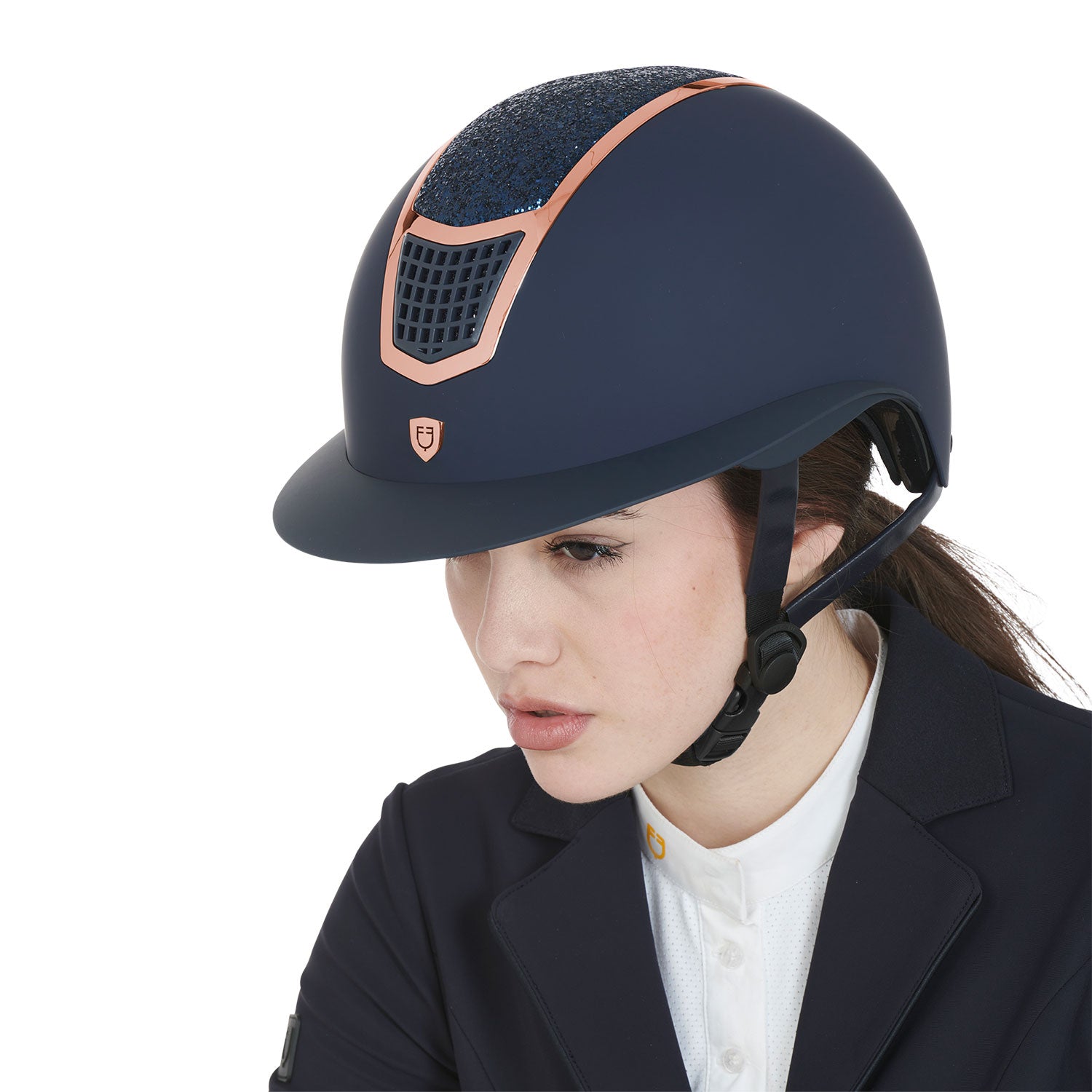 La calotta esterna è opaca, impreziosita dall'applicazione di brillantini, tono su tono, e da targhetta con logo Equestro