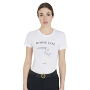 T-shirt donna slim fit, in cotone a mezza manica, impreziosita da una composizione di strass, scritta "horse life" e logo Equestro.