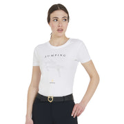 T-shirt donna slim fit in cotone a mezza manica impreziosita da una composizione di strass, con scritta "jumping" e logo Equestro.