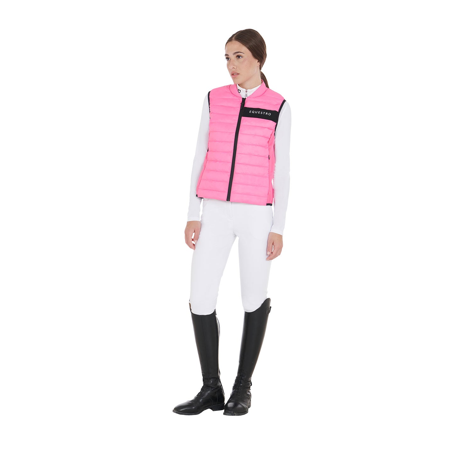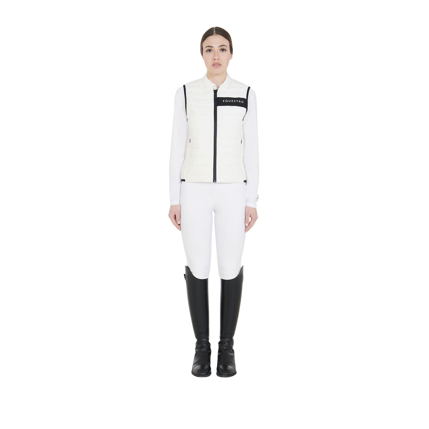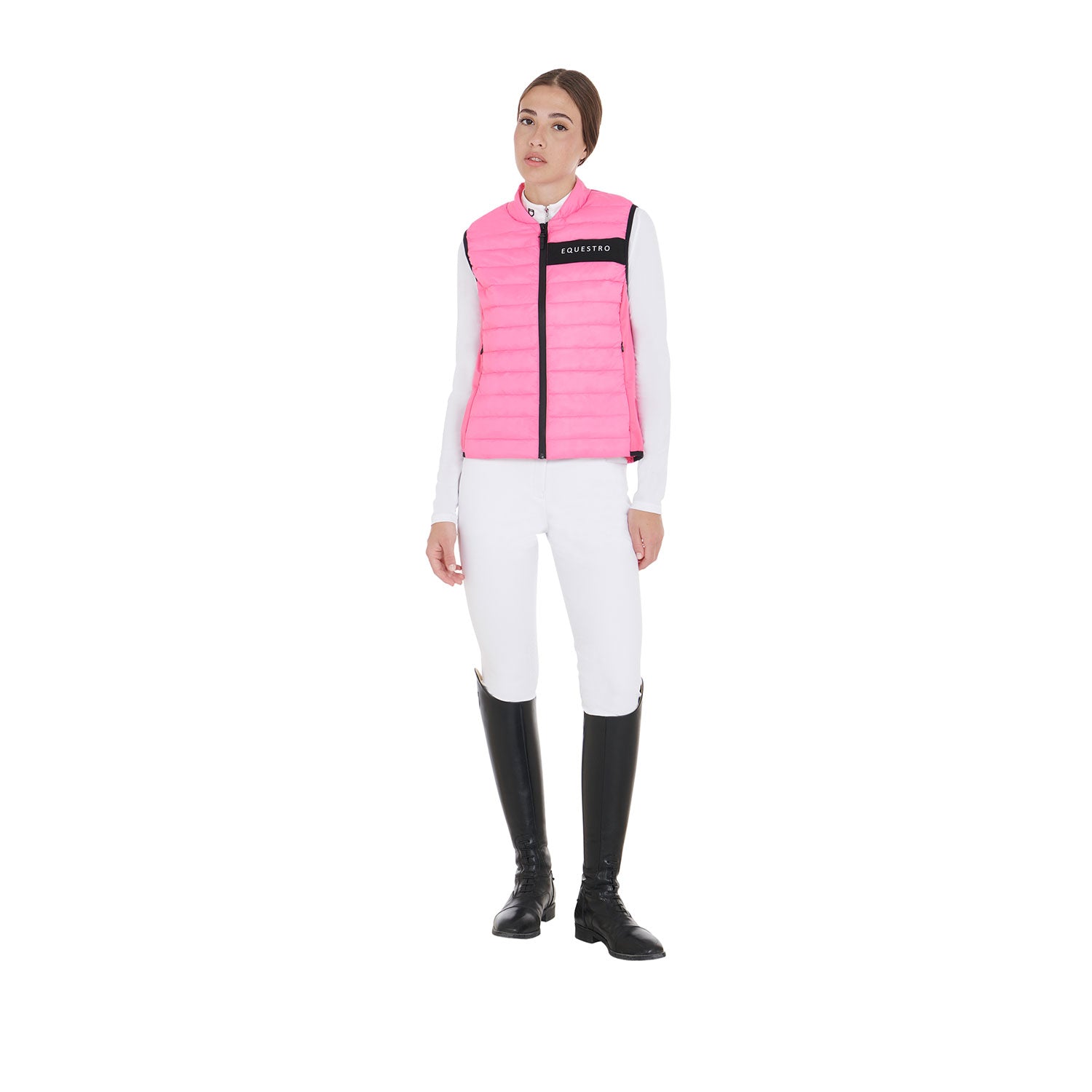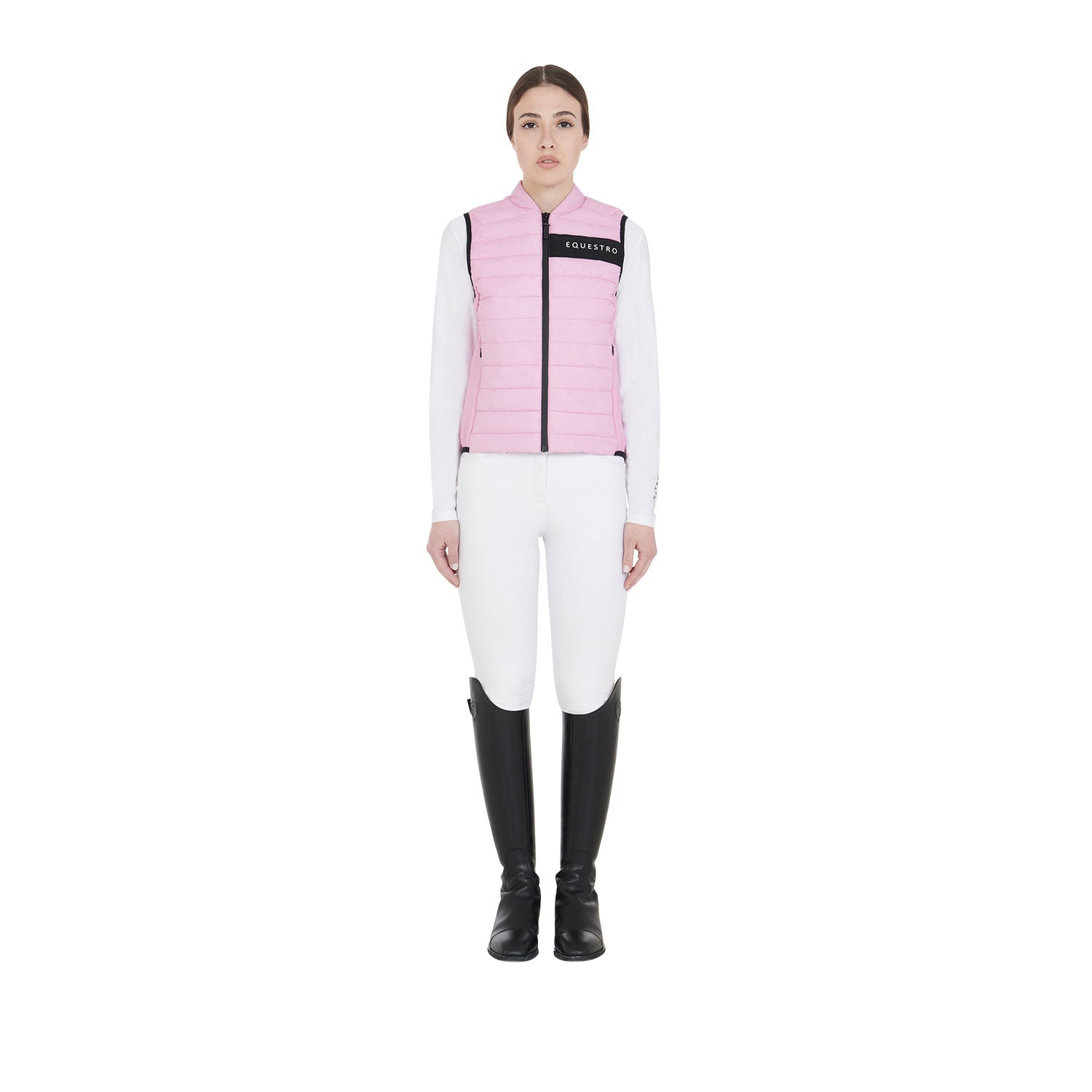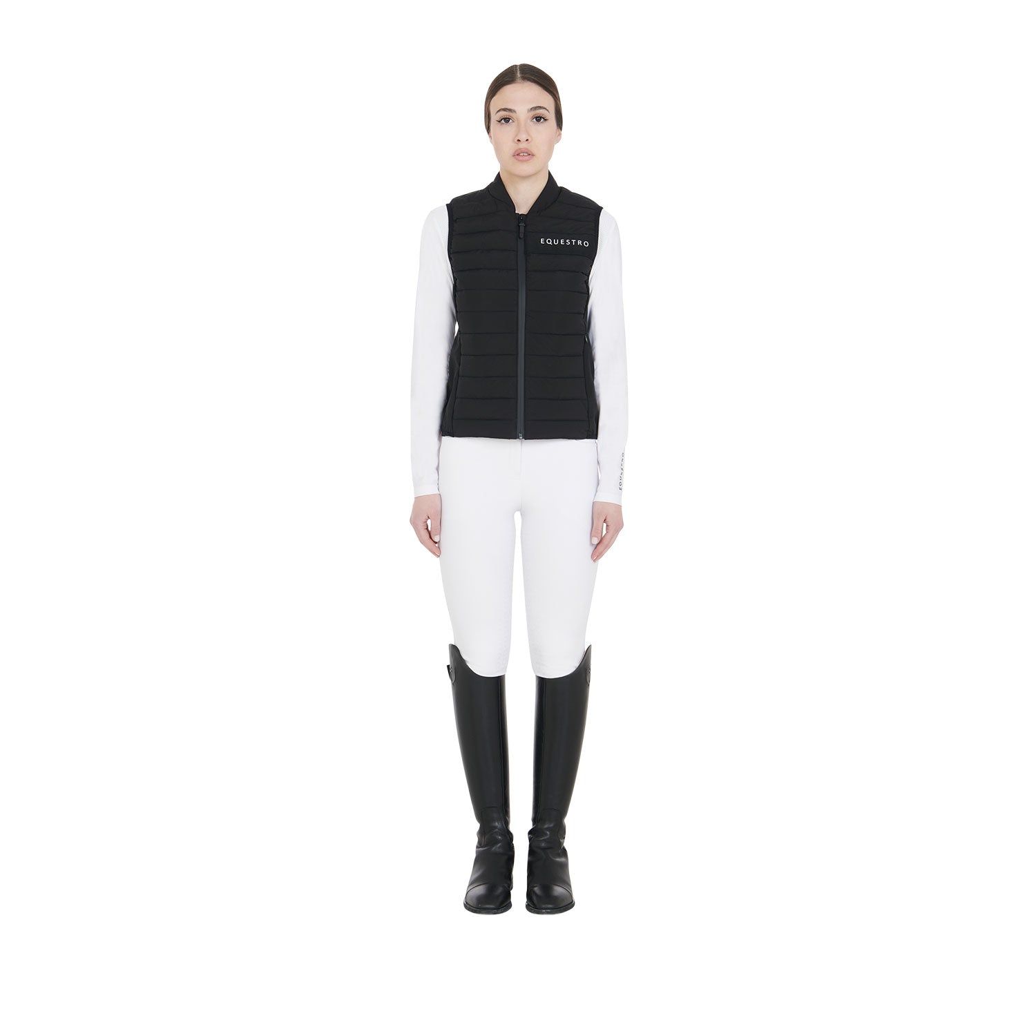 smanicato tecnico donna in tessuto traspirante, leggermente imbottito in modo tale da poter essere utilizzato anche a basse temperature. Impreziosito da una chiusura a zip con sistema antivento, due tasche laterali e scritta Equestro sulla parte sinistra del petto.