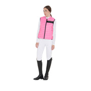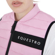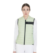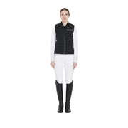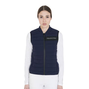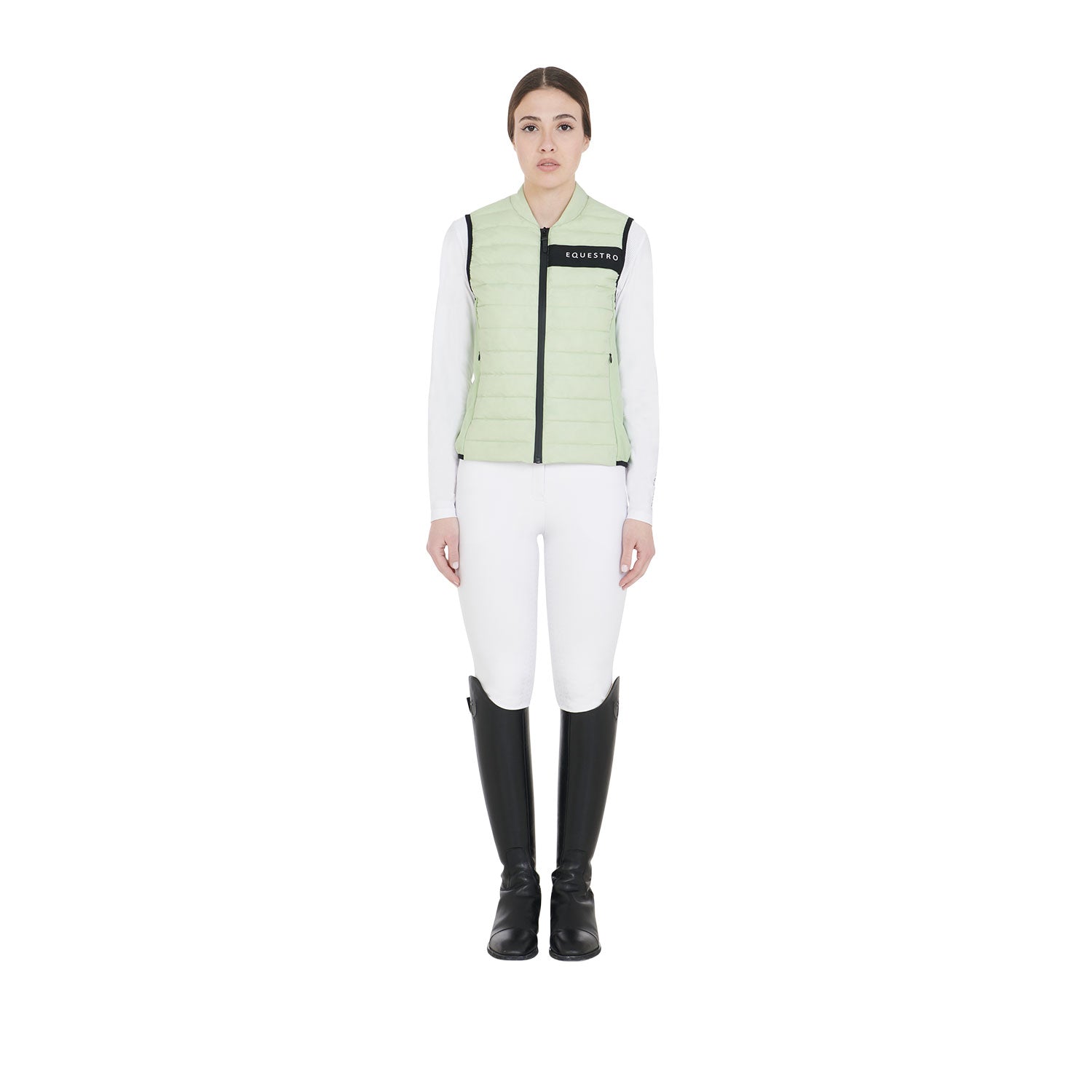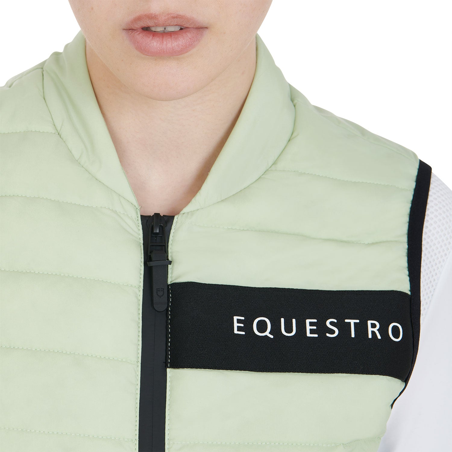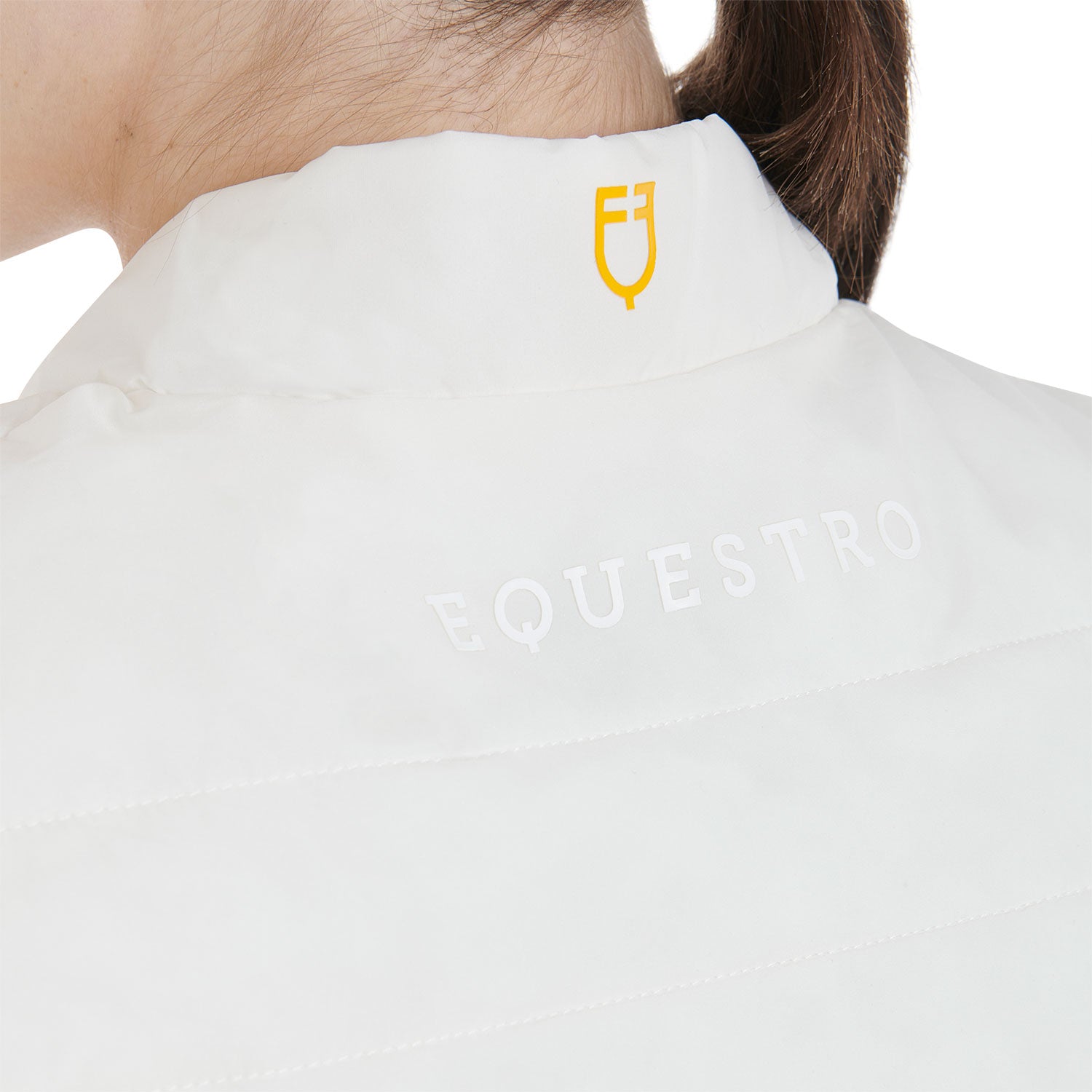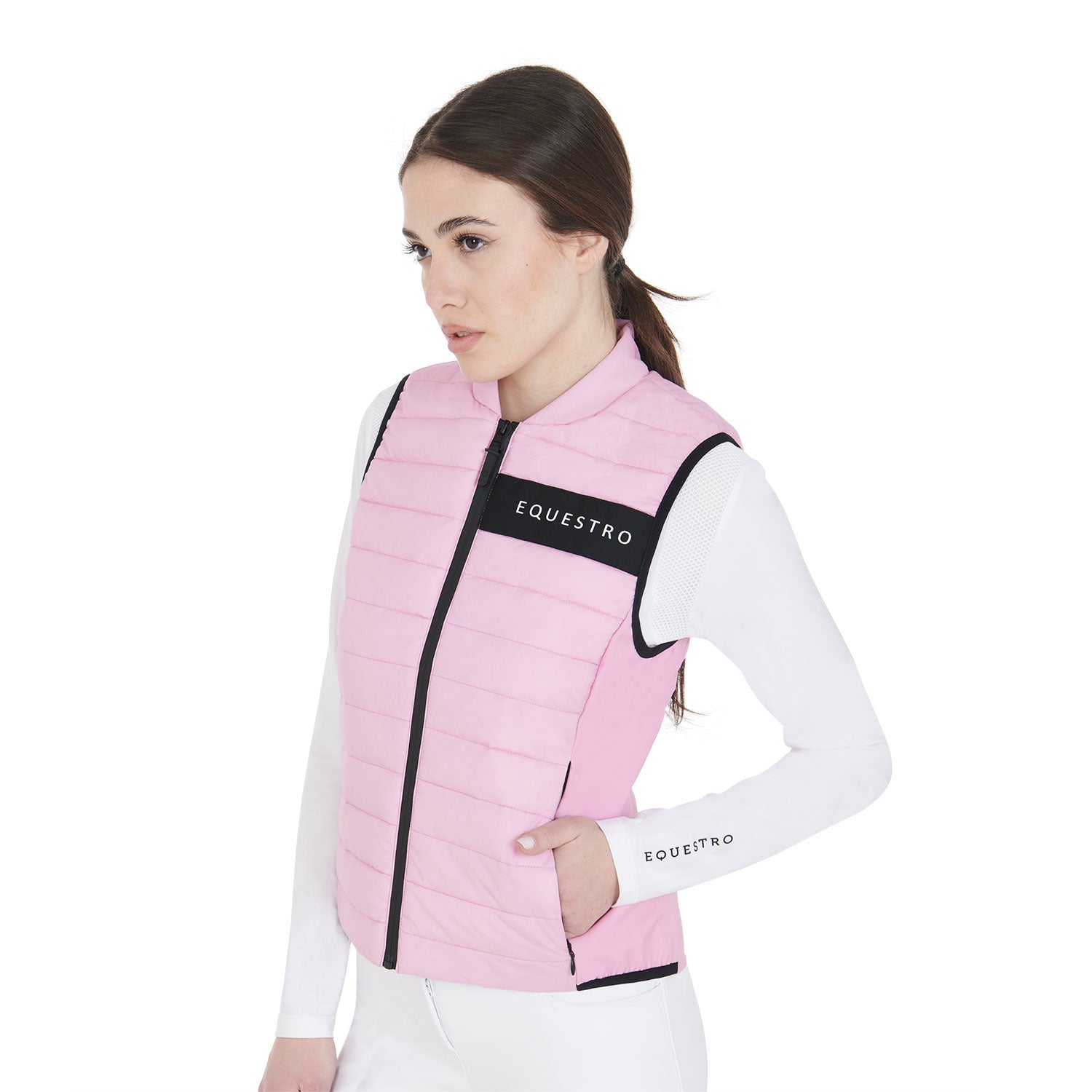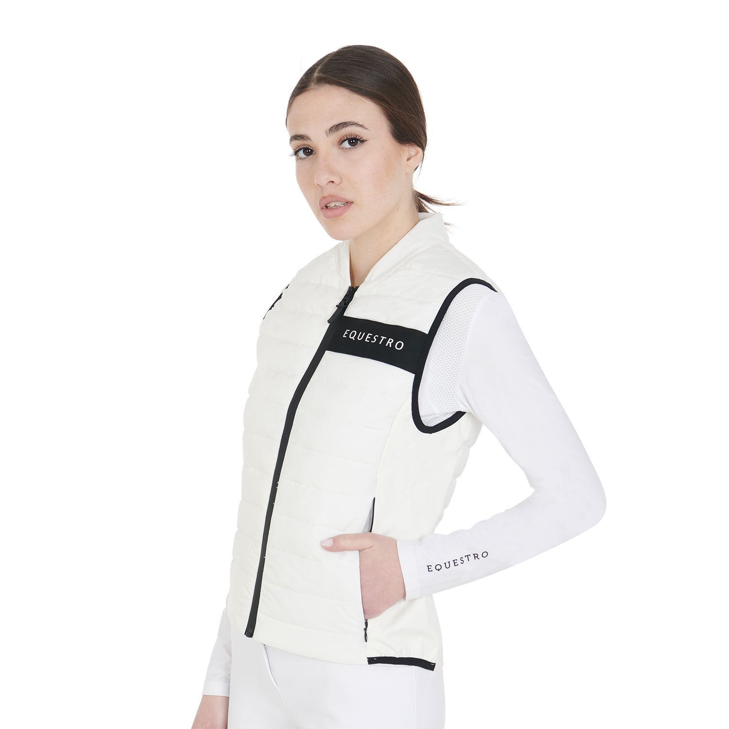 smanicato tecnico donna in tessuto traspirante, leggermente imbottito in modo tale da poter essere utilizzato anche a basse temperature. Impreziosito da una chiusura a zip con sistema antivento, due tasche laterali e scritta Equestro sulla parte sinistra del petto.