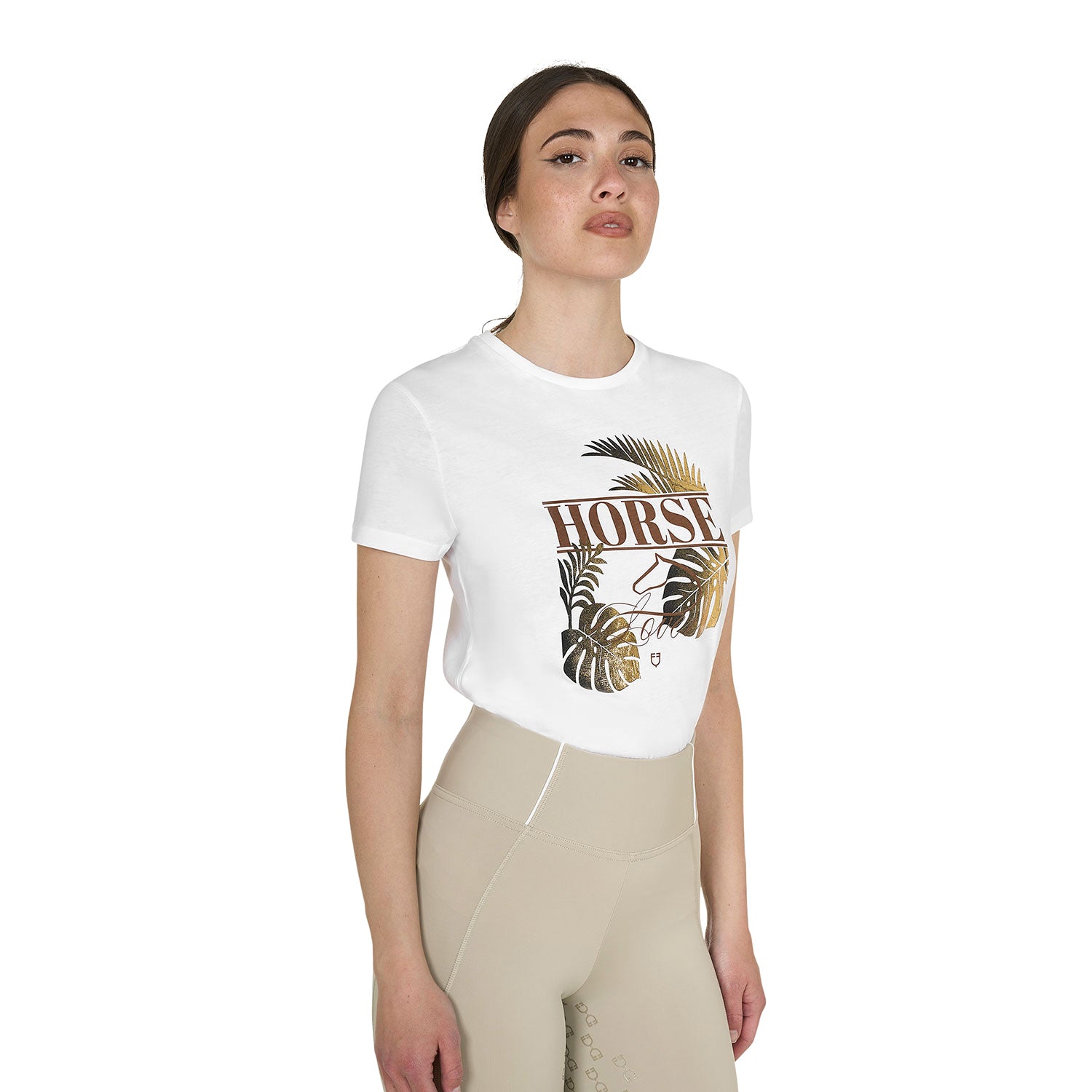 T-shirt donna slim fit in cotone a manica corta con stampa in lamina oro e scritta Horse Love. Stile perfetto, vestibilità impeccabile ed eleganza senza tempo.
