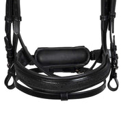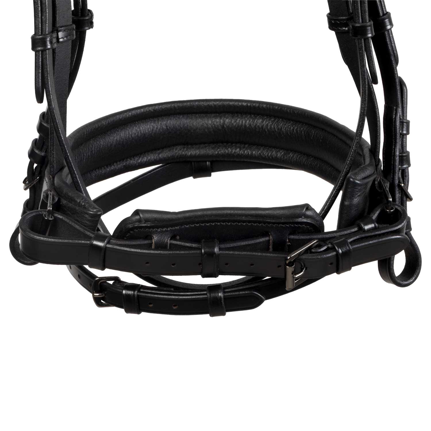 Il sovracapo, imbottito e regolabile, ha una forma anatomica studiata per distribuire uniformemente la pressione sulla zona più sensibile della nuca, assicurando il massimo comfort per il cavallo.