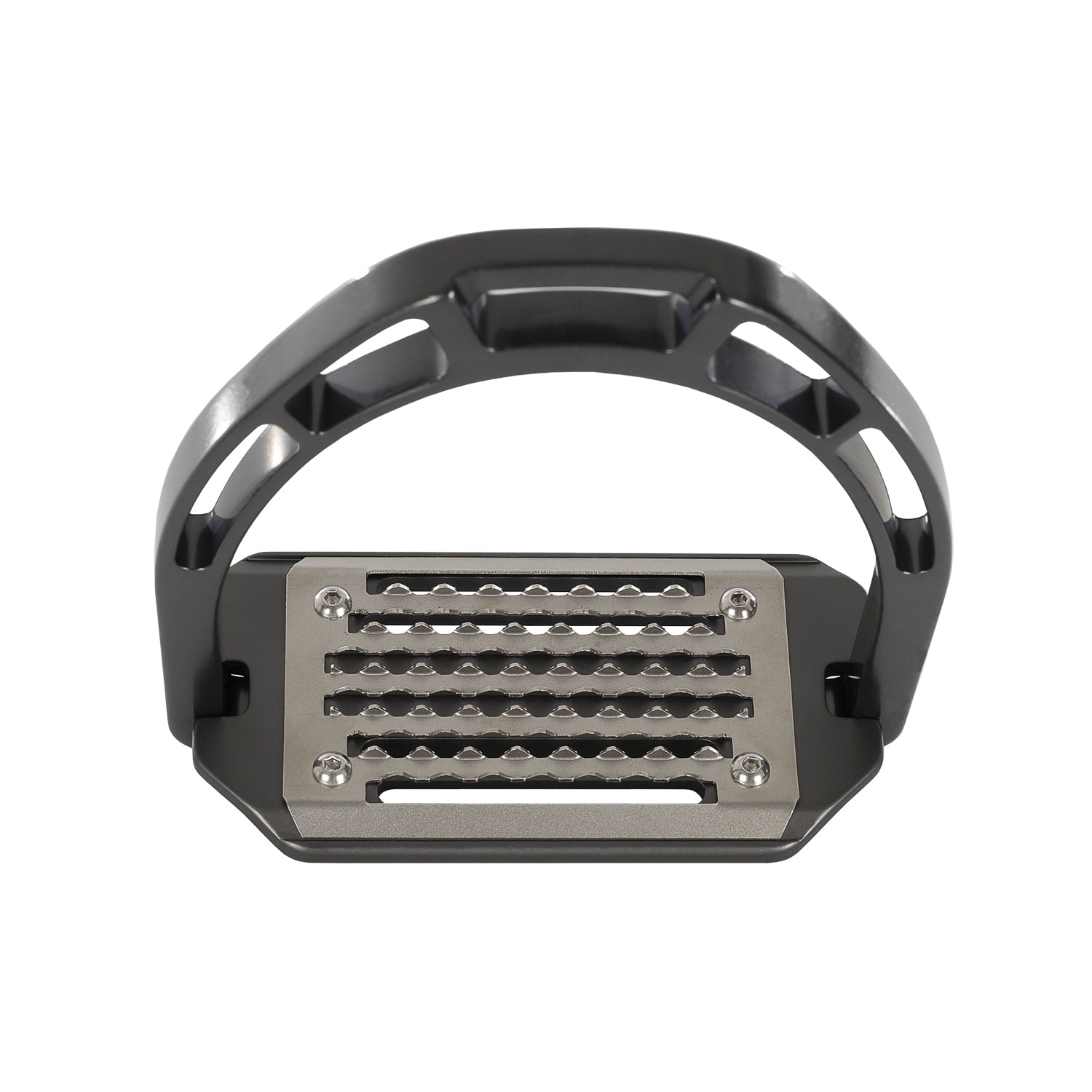 La parte superiore della panca è realizzata in acciaio inossidabile, con lunghi fori orizzontali. L'inclinazione della panca di 5° aiuta i cavalieri ad assumere la corretta postura, alleviando le tensioni di caviglie, polpacci, ginocchia e fianchi.
