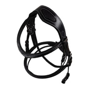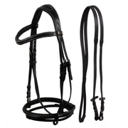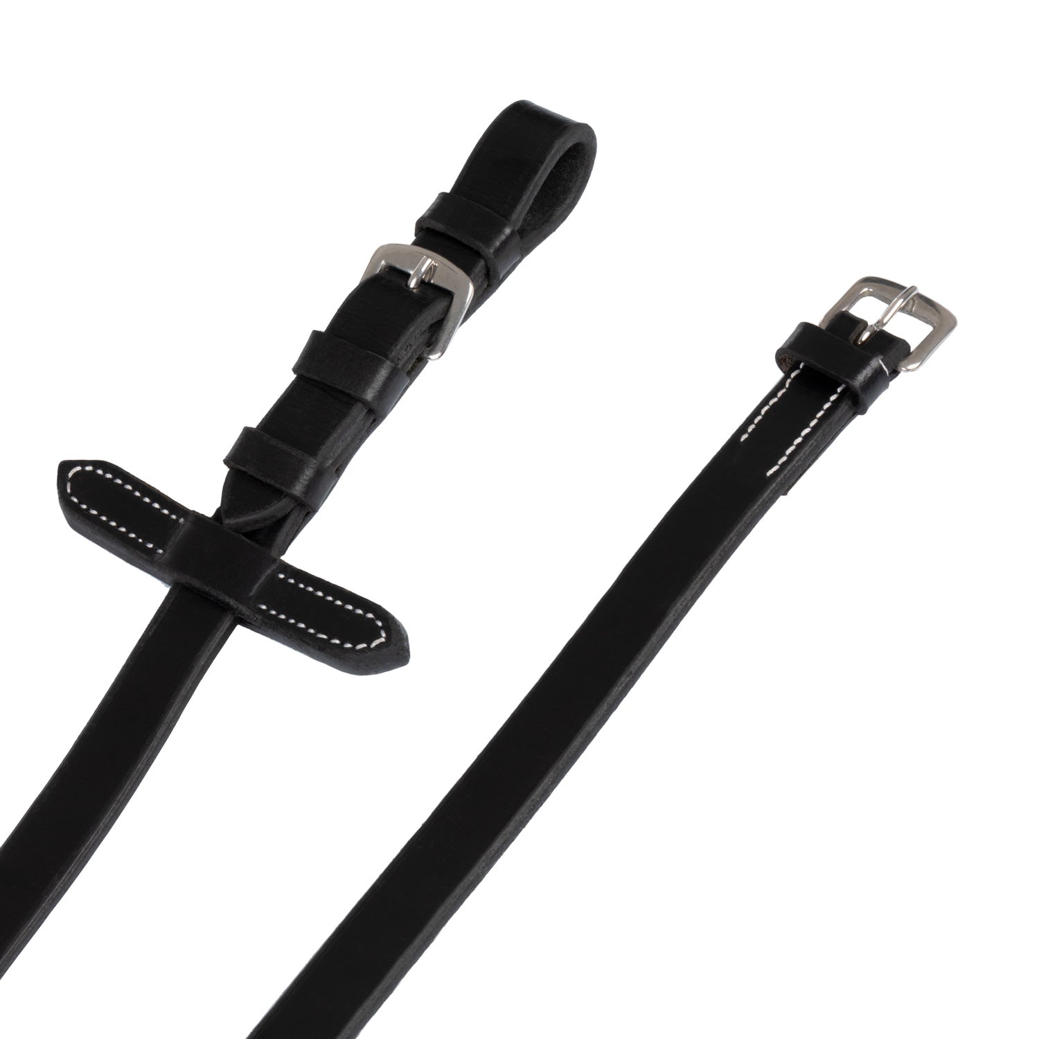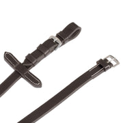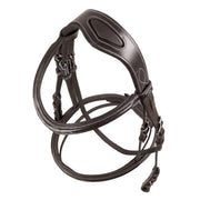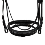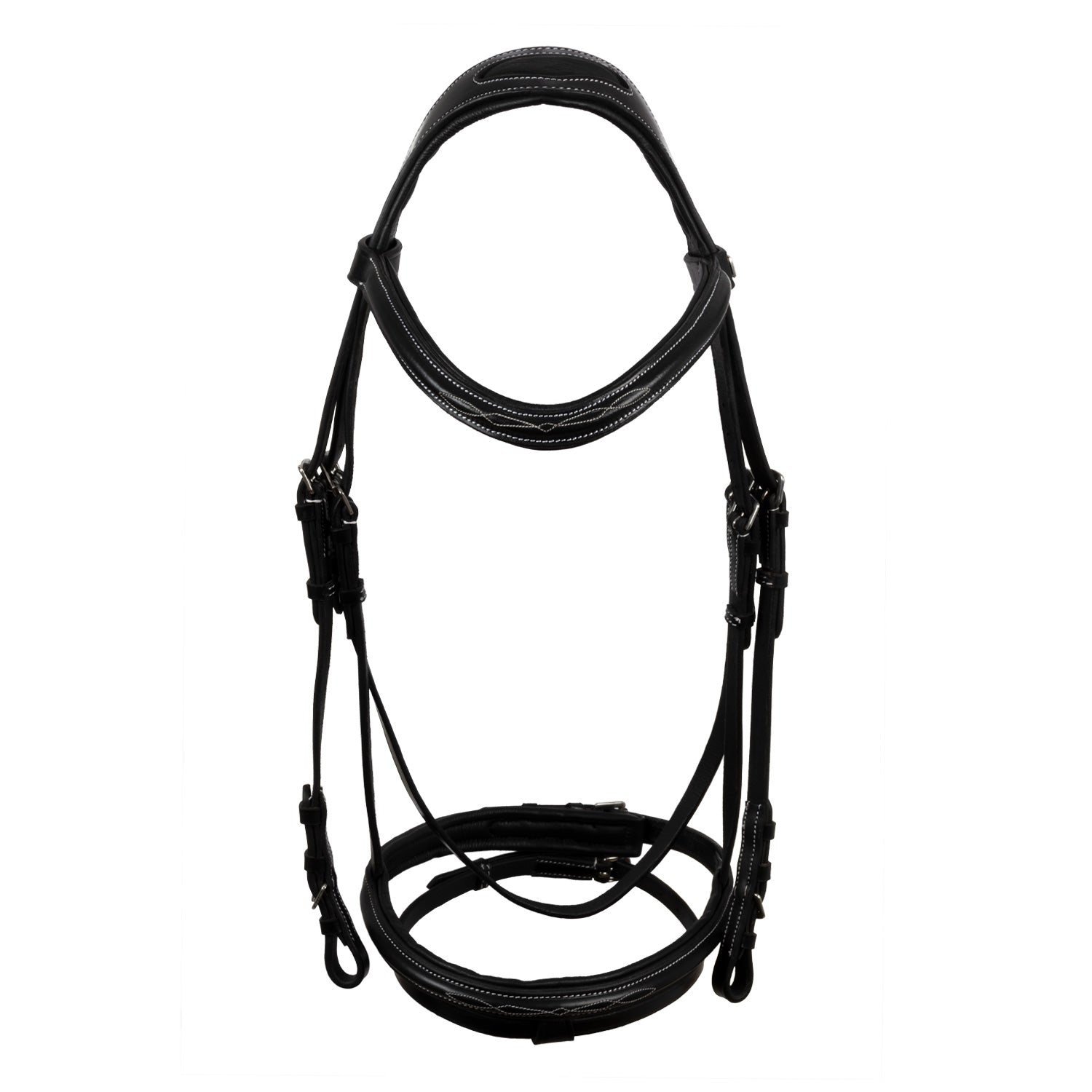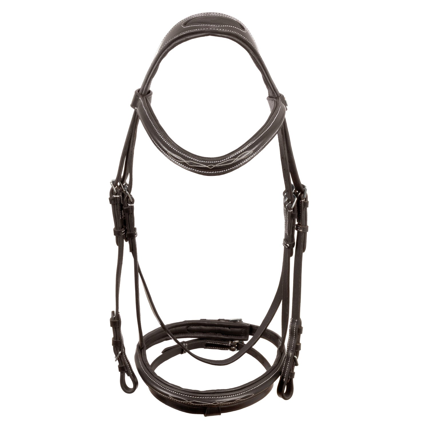 Testiera inglese in cuoio superiore, frontalino con cuciture bianche, completa di redini in gomma