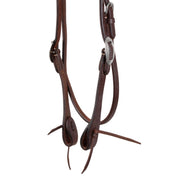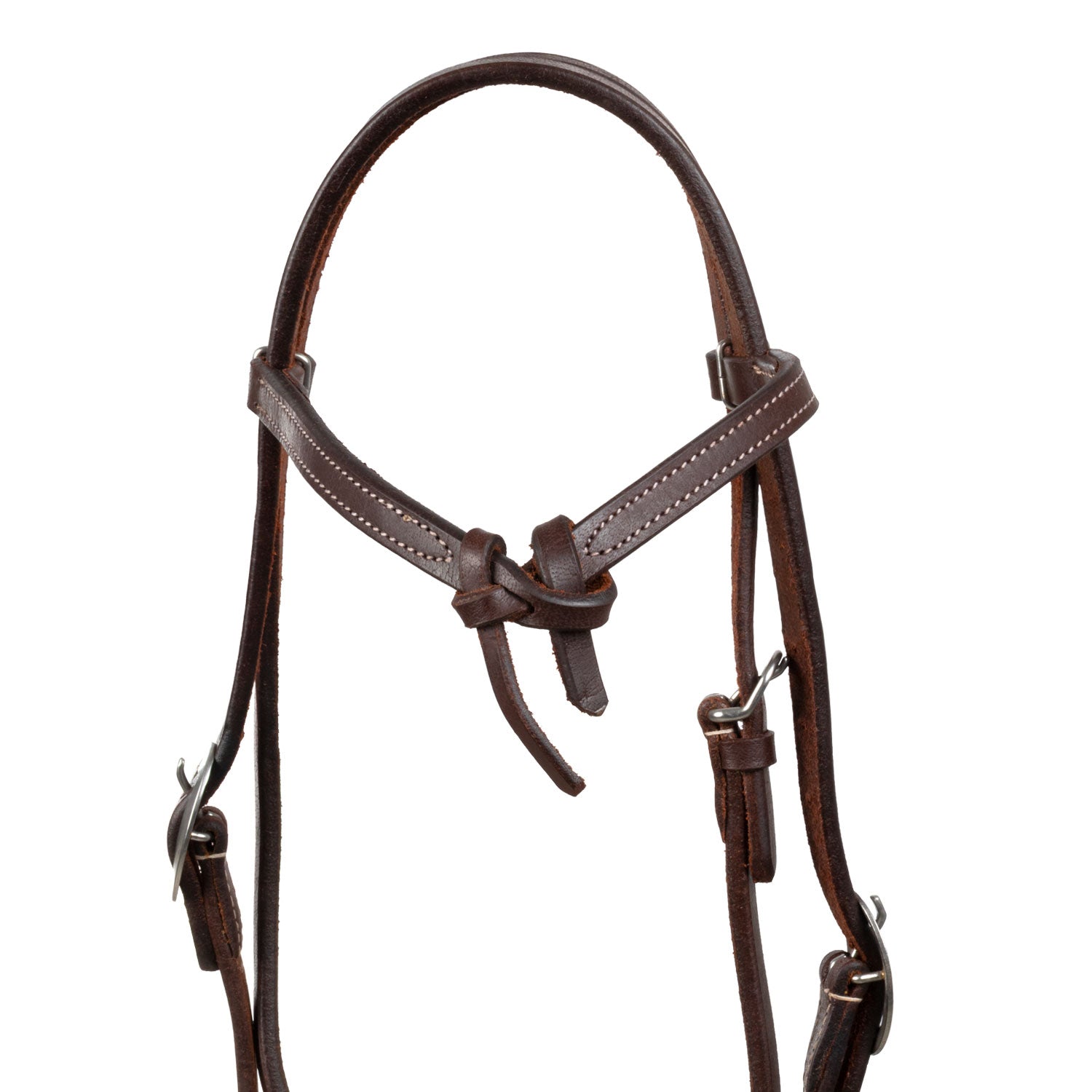 Testiera western modello Futurity in cuoio di alta qualità con dettaglio nodo intrecciato sul frontalino, super resistente grazie alle fibbie in acciaio inox e raffinata grazie alle decorazioni e alla cura dei particolari.
