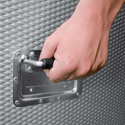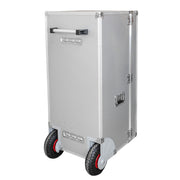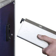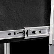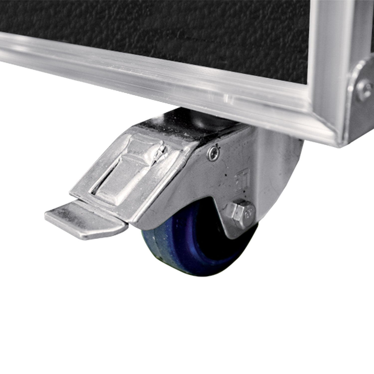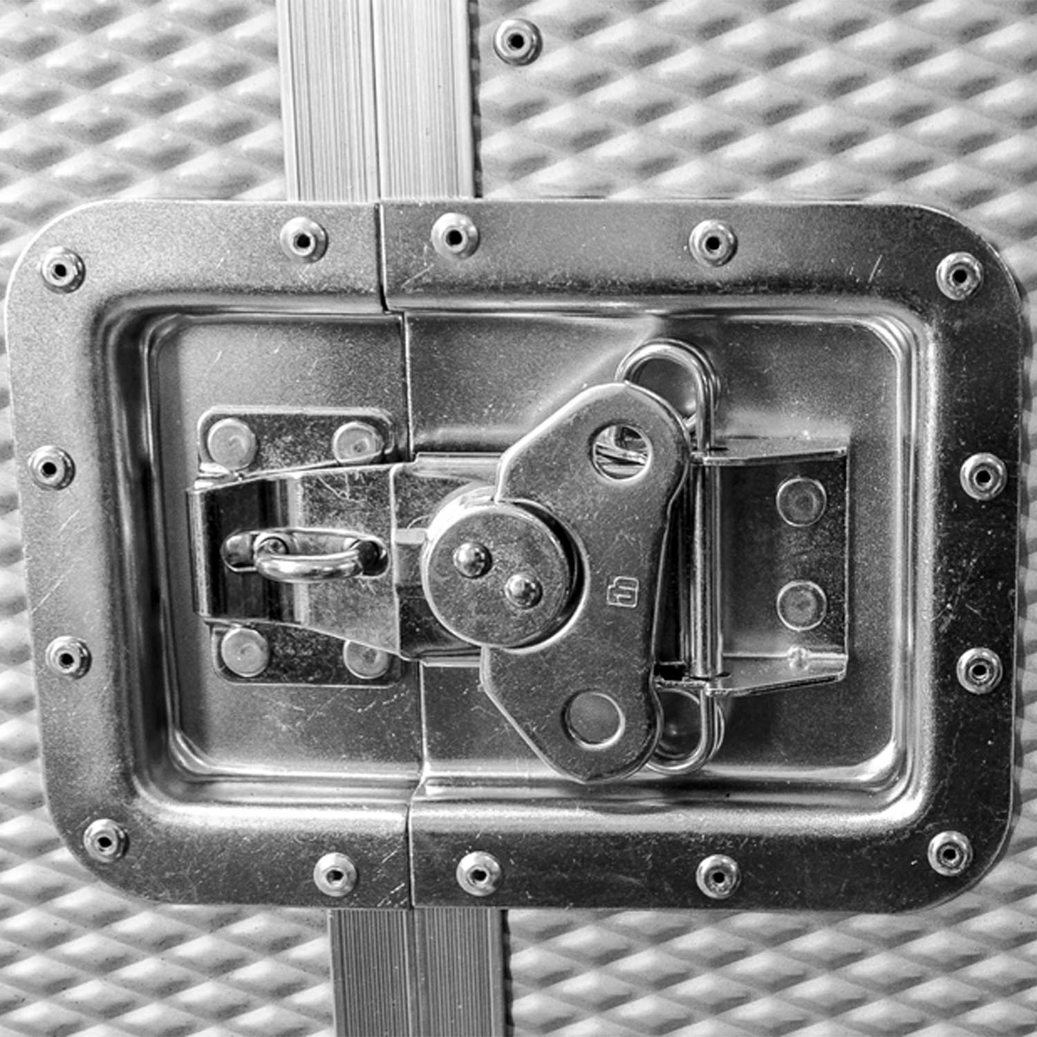 Profili e accessori: bordature in alluminio; apertura anteriore; profilo angolare in alluminio con spalla da mm 25 anodizzato; profilo ermetico a doppia gola in alluminio anodizzato; n°6 cantonali; n°2 serrature a farfalla ad incasso con predisposizione per il lucchetto; n°1 maniglia di presa ad incasso ai fianchi; n°1 maniglione di presa sul dietro; n°2 ruote pneumatiche montate ad incasso su vasca; n°3 ruote girevoli dim