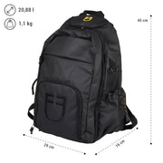 Realizzato in robusto materiale di colore nero con spallacci ergonomici imbottiti e regolabili con ancoraggio dello zaino al corpo progettato tramite fibbia.