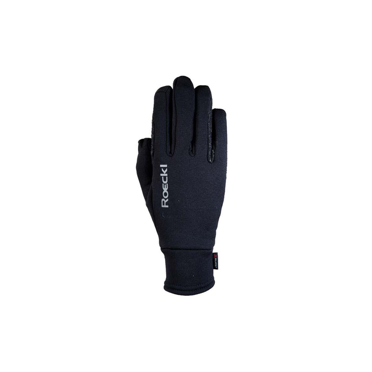 Il palmo con innumerevoli piccoli loghi ROECKL siliconati garantisce una perfetta presa sulle redini. La zona tra l'anulare e il mignolo, ovvero la parte del guanto che entra in contatto con le redini, presenta un ulteriore rinforzo siliconato. L'ausilio per l'inserimento facilita l'inserimento dei guanti.