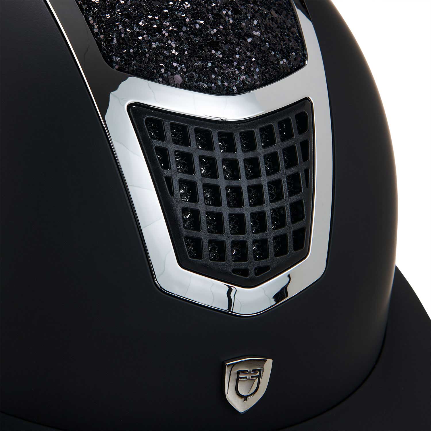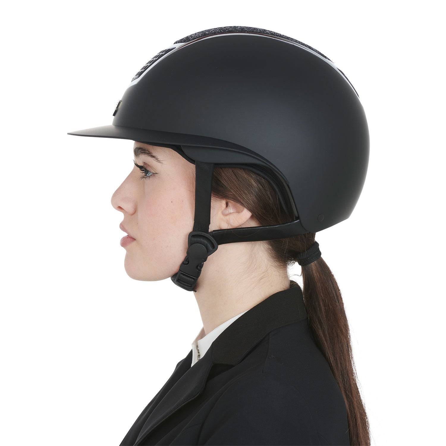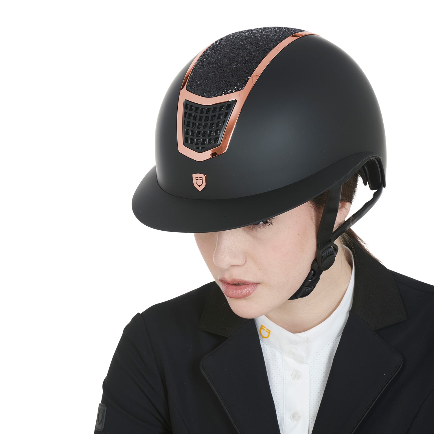 La calotta esterna è opaca, impreziosita dall'applicazione di brillantini, tono su tono, e da targhetta con logo Equestro