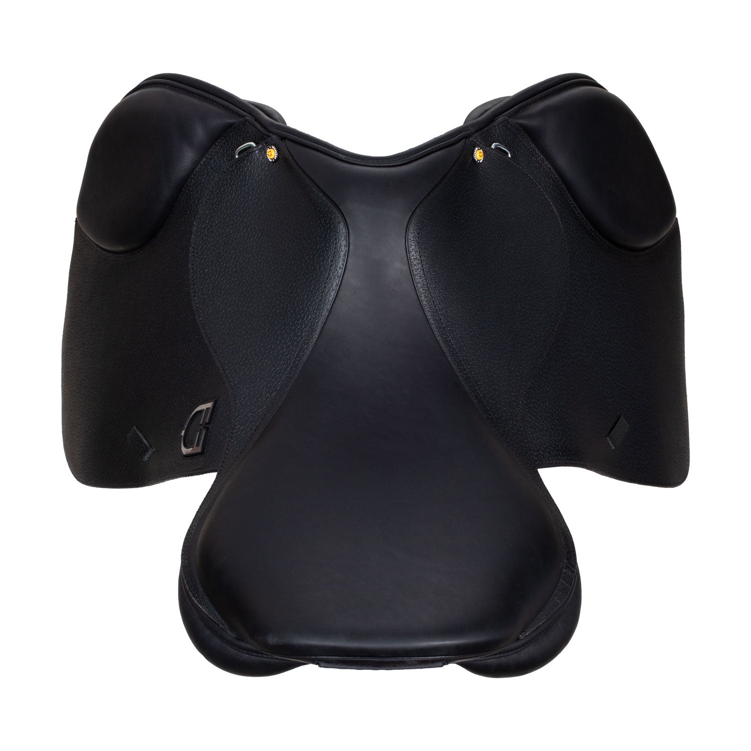 Realizzata con la particolare forma anatomica che consente di distribuire equamente la pressione sulla schiena lasciando totalmente libero il garrese.