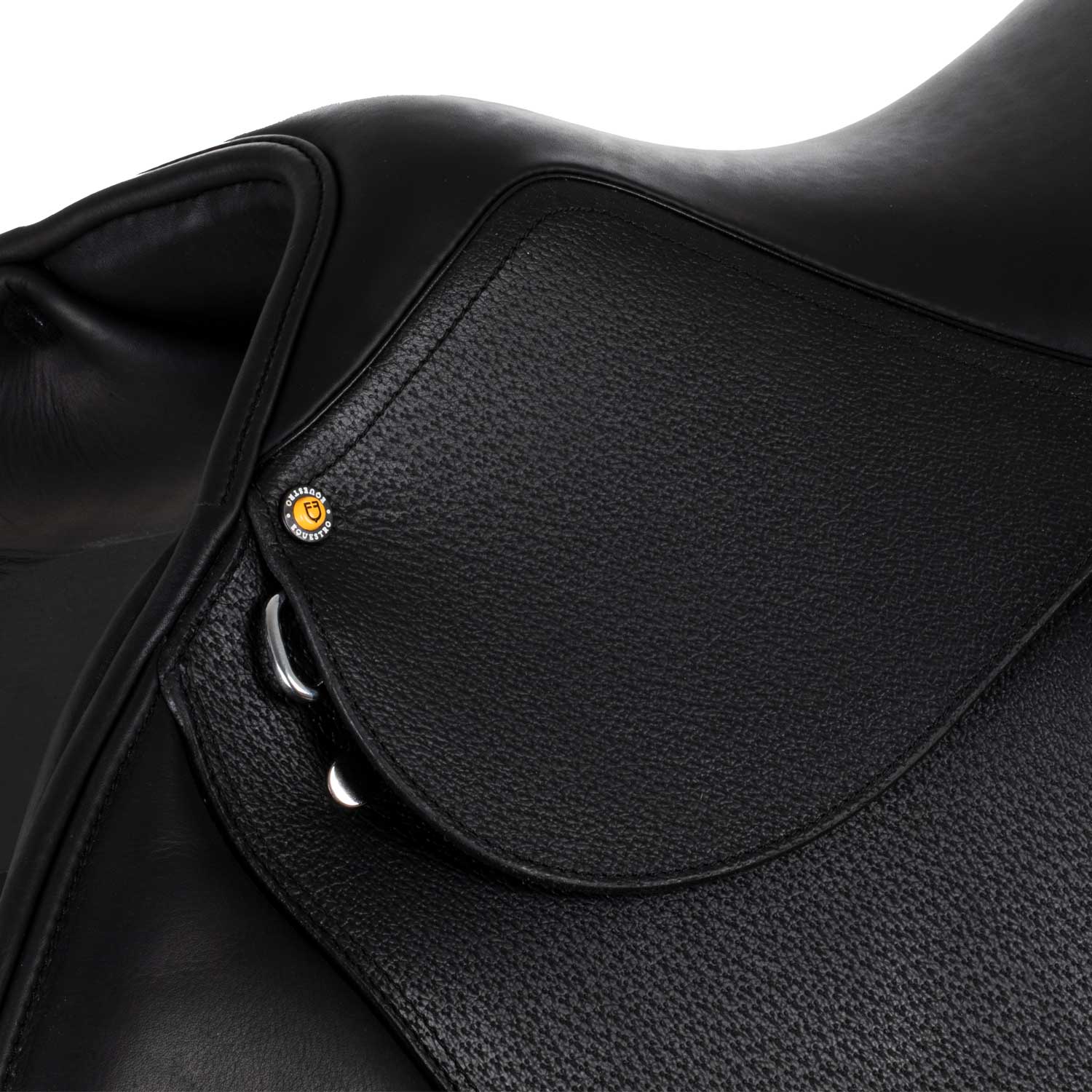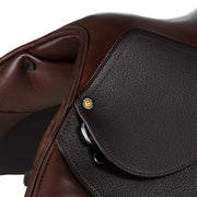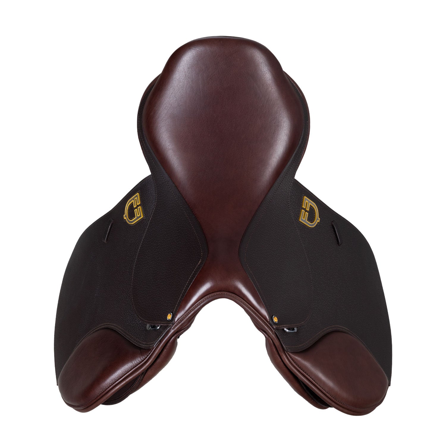 Sella da salto in morbido cuoio di alta qualità realizzata a partire dall'idea di una sella snella semplice ed elegante.