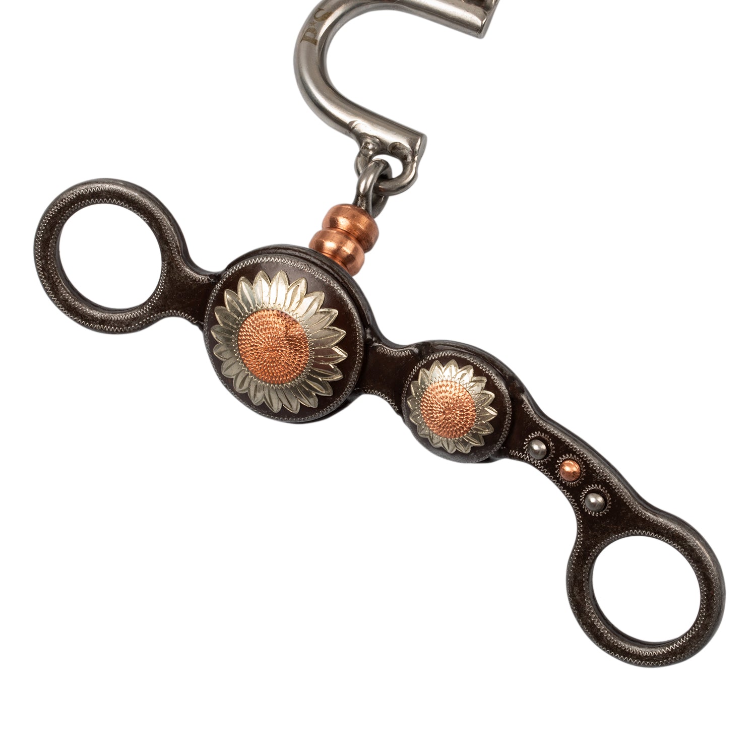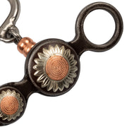 Morso correctional pool's per monta western in resistente ferro nero lavorato e decorato con applicazioni di fiori in rame e argento, dotato di ponte mobile e rulli in rame in modo tale da aumentare il movimento nella bocca del cavallo e con esso agevolare la masticazione. Ogni dettaglio come le aste piegate è curato e lavorato con minuziosa attenzione per un risultato superiore.