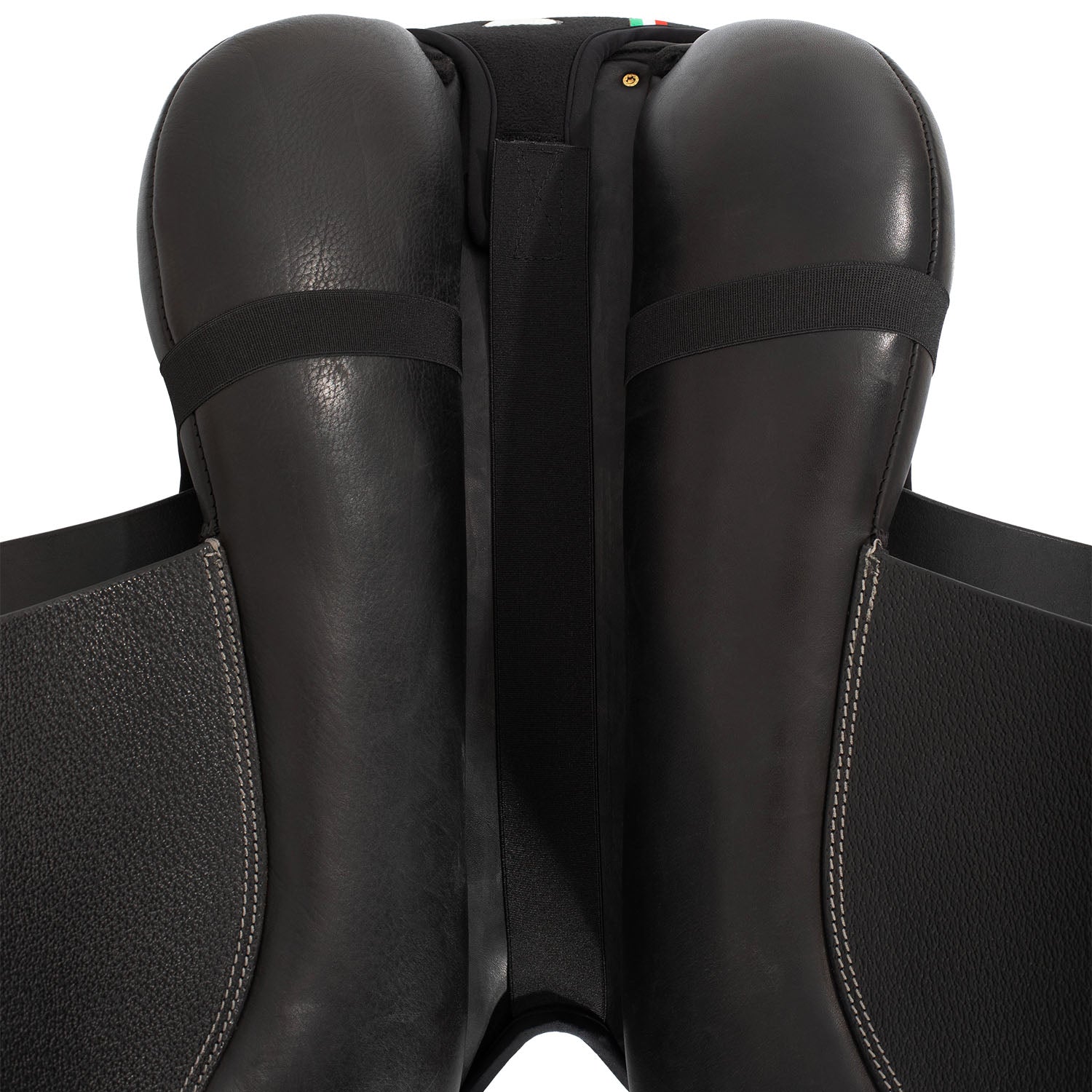 La cinghia elastica si aggancia ai cuscini, mantenendo l'assetto originale della sella. I cinturini con grip si fissano ai cuscini interni, conservando il design elegante.