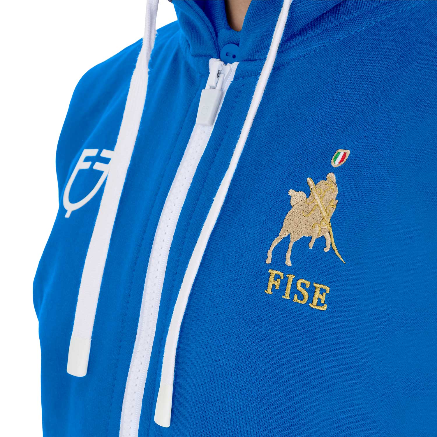 La presenza di decorazioni in piping a contrasto, rende il capo elegante, in pieno stile Equestro e i ricami FISE rendono la felpa unica nel suo genere.