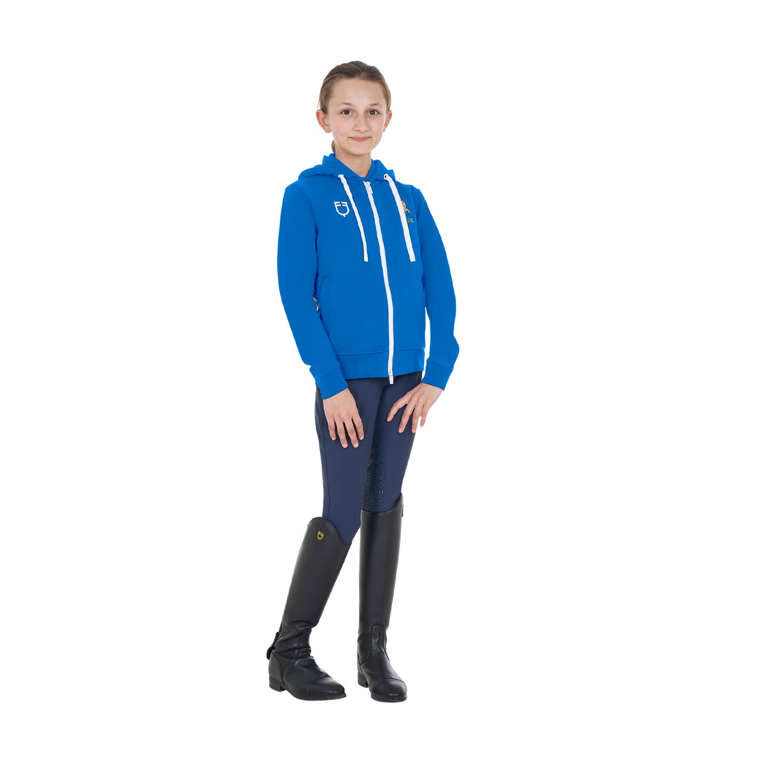 Felpa bambini Equestro X FISE realizzata in morbido pile con pratica zip frontale antivento e cappuccio regolabile, per offrire al cavaliere un'impareggiabile comfort.