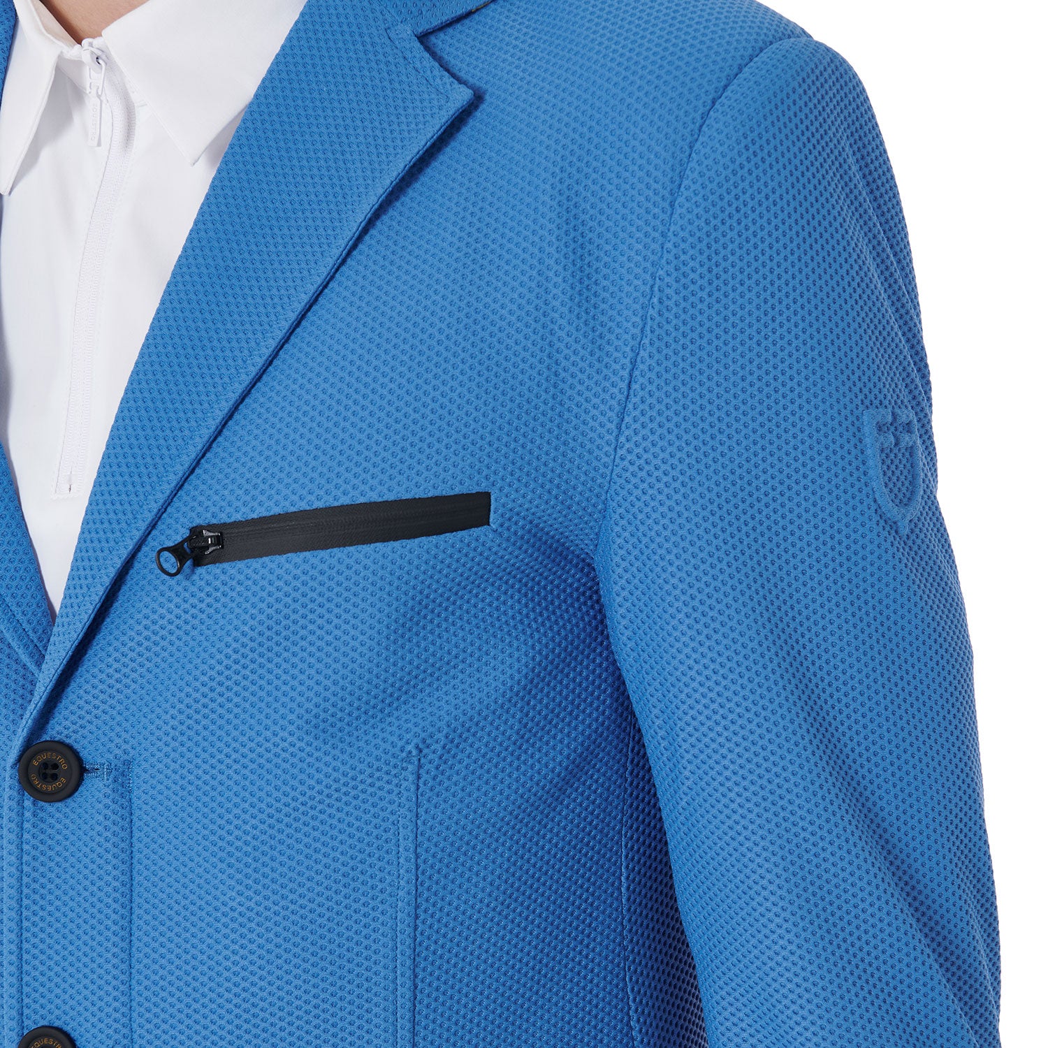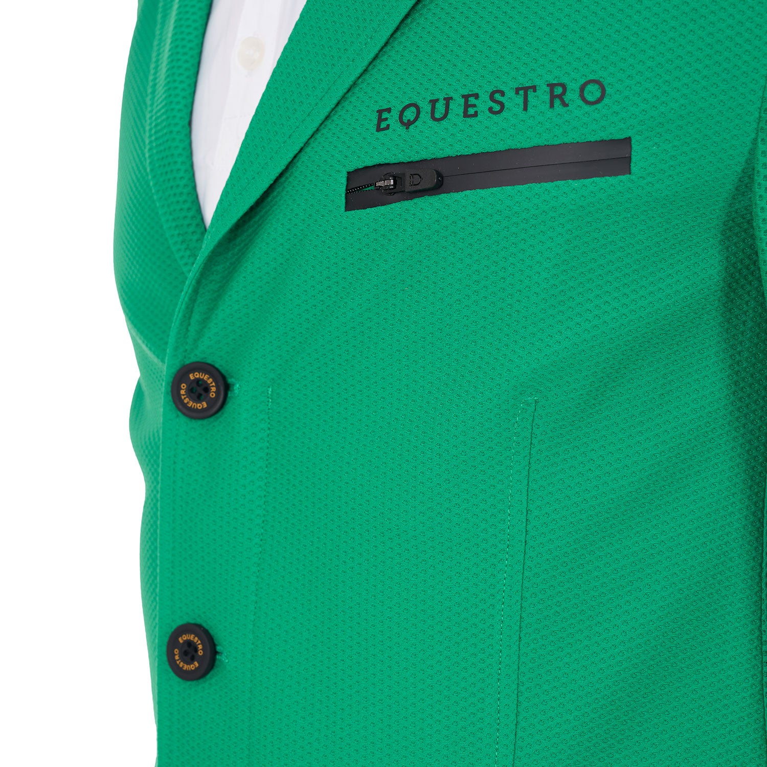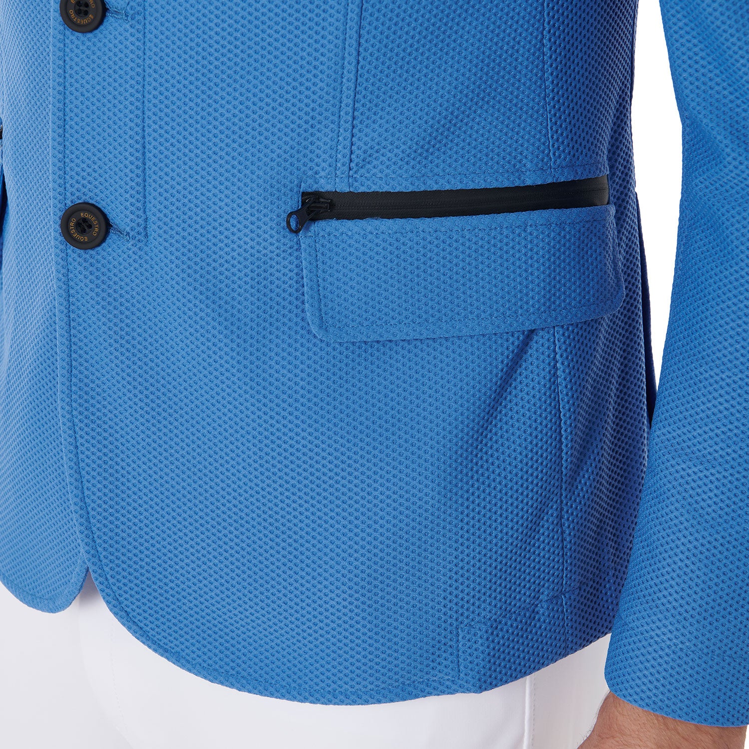 La giacca è impreziosita da tasche a soffietto con zip spalmata e tasca lato cuore con logo Equestro stampato tono su tono.