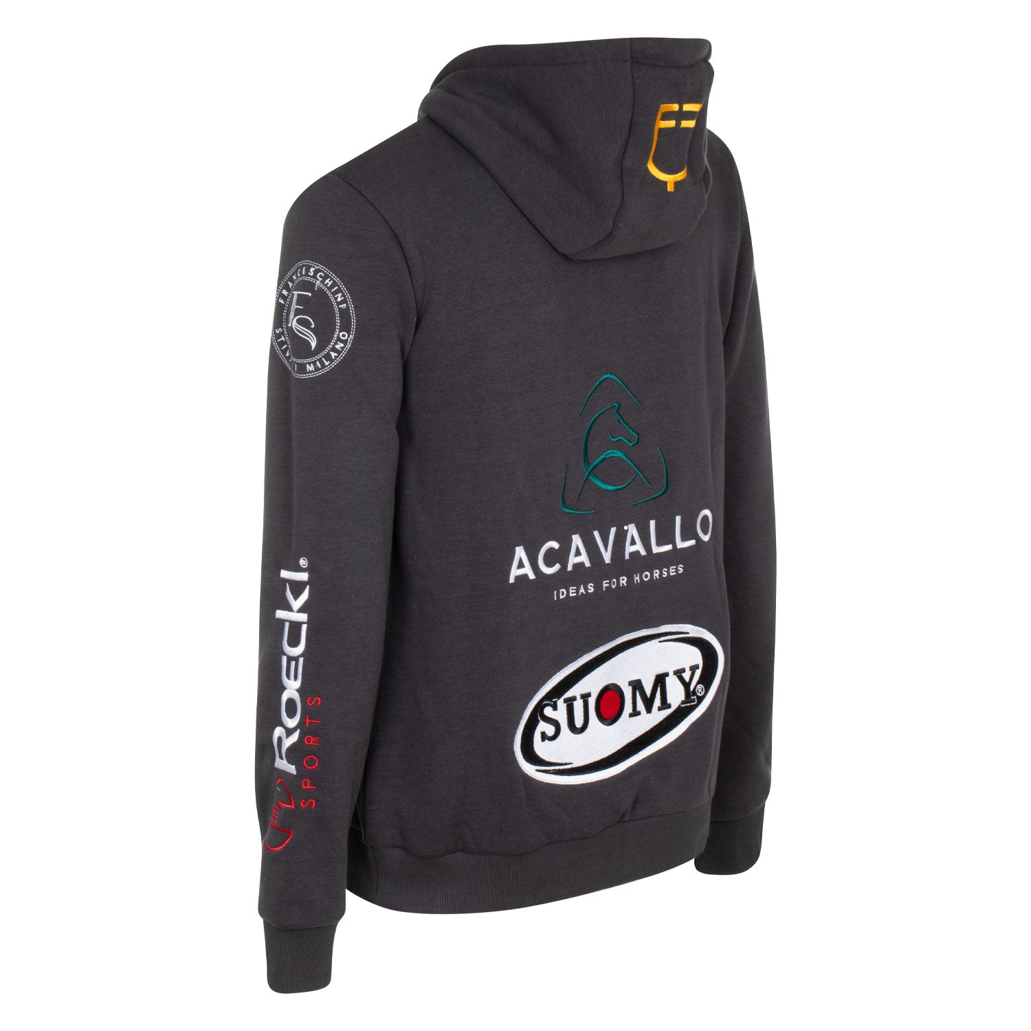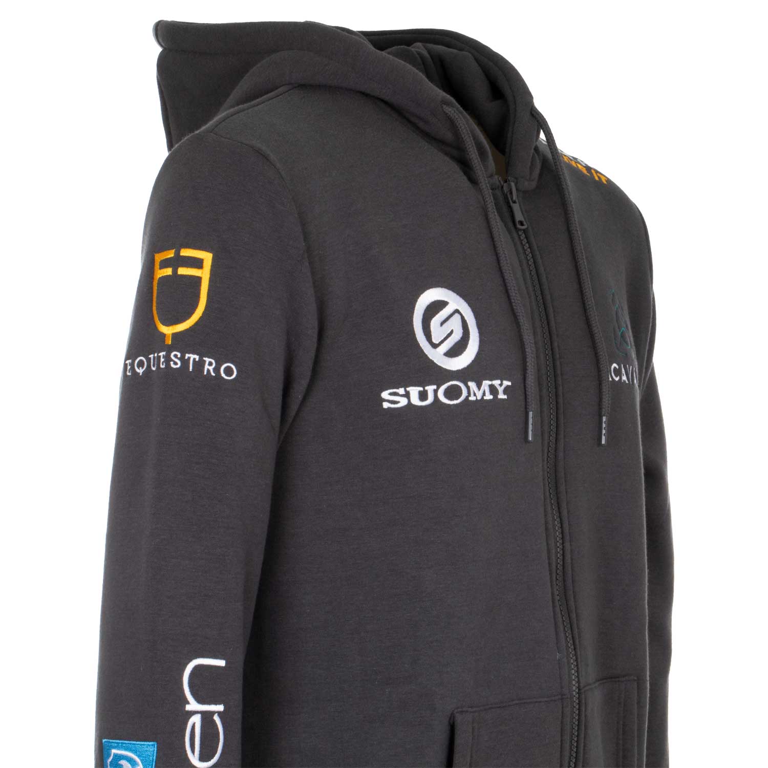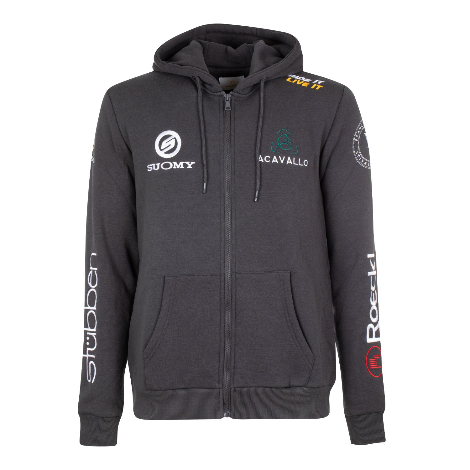 La felpa è impreziosita da patches che raffigurano i loghi dei marchi più iconici del mondo equestre.