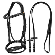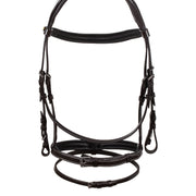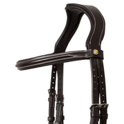 Testiera inglese realizzata con pregiato cuoio morbido, caratterizzata da fibbie in acciaio inossidabile che assicurano durabilità e stabilità nel tempo. Sia il frontalino che la capezzina sono impreziositi da bordi cuciti con ricami a contrasto.