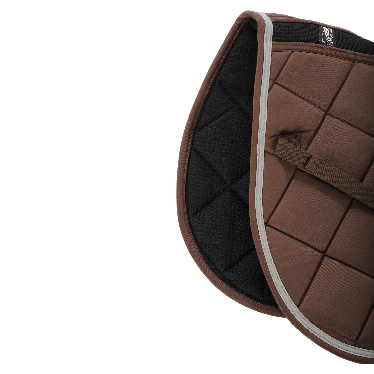 L'inserto centrale in rete si adatta perfettamente alla conformazione del cavallo, elimanando la pressione spinale e migliorando l'aderenza alla sella.