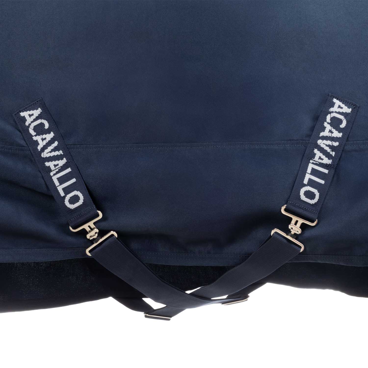 La chiusura rapida sul petto con moschettoni cromati e chiusura a strappo rende l'applicazione della coperta semplice e veloce.