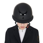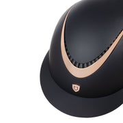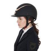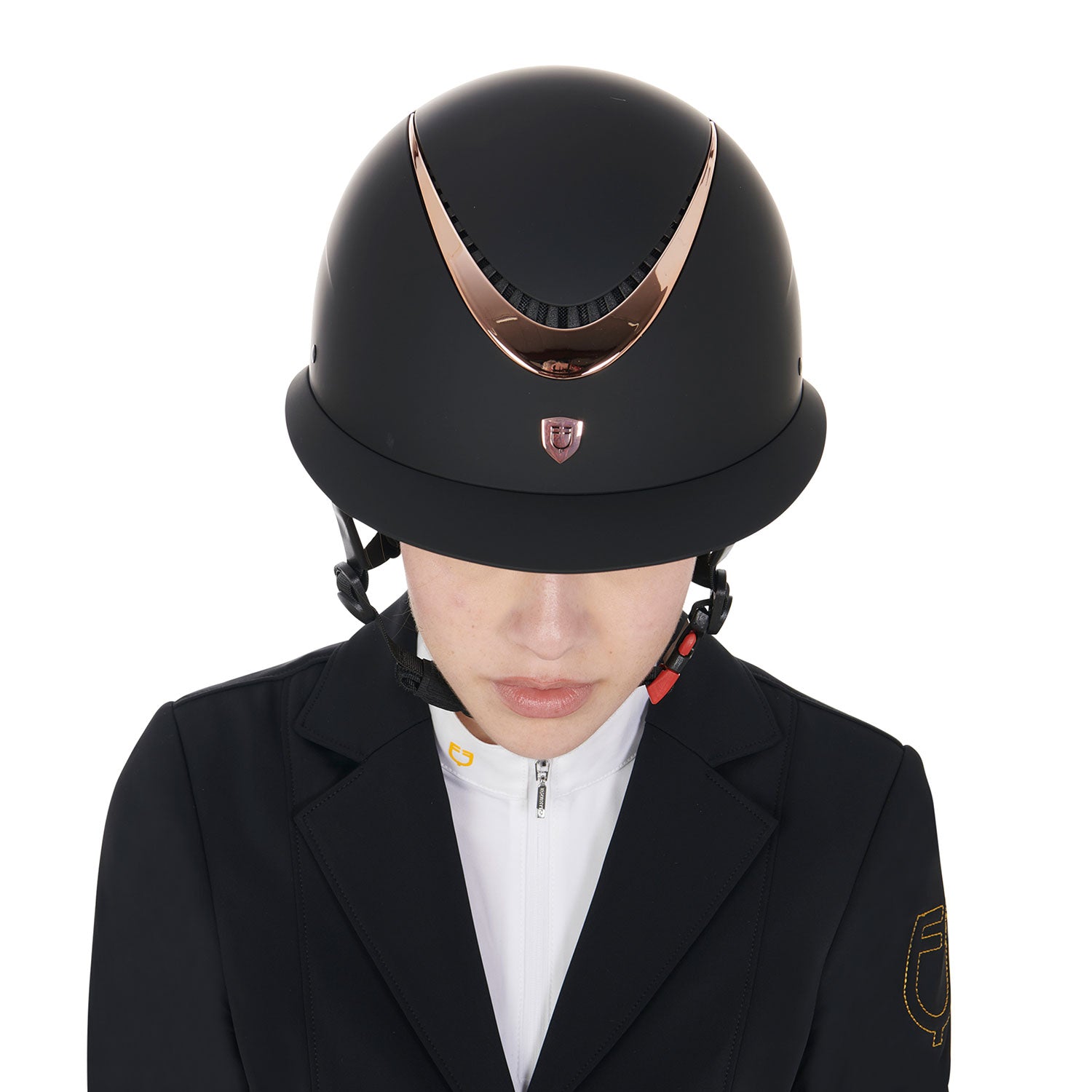 La presenza della targhetta con Logo tono su tono con il frame, rende il casco elegante e raffinato, in pieno stile Equestro.