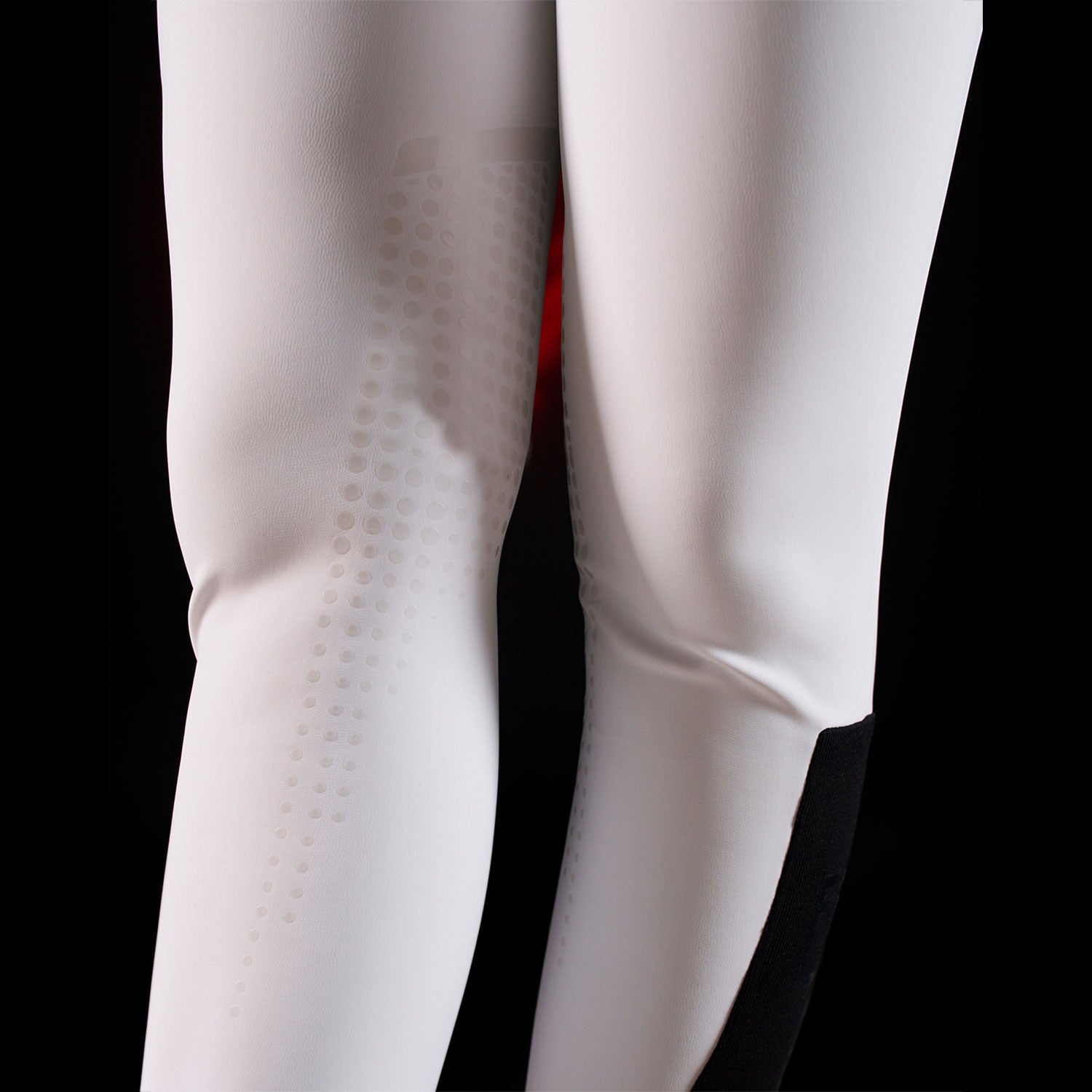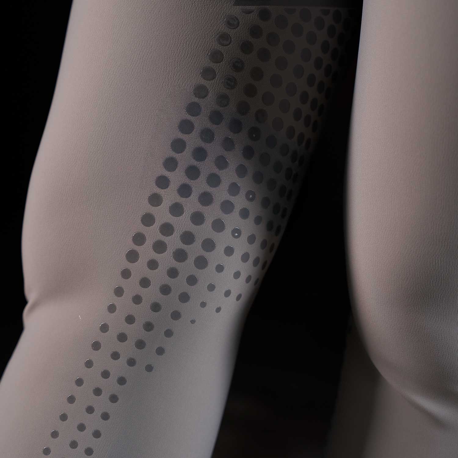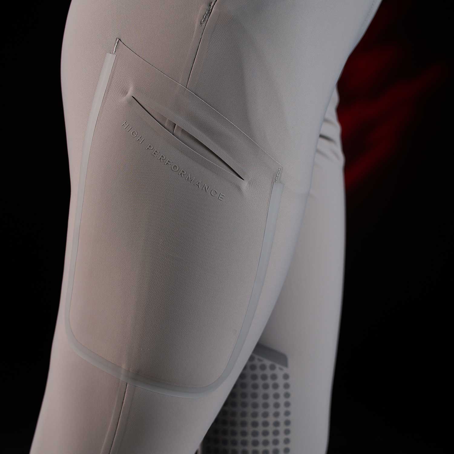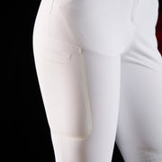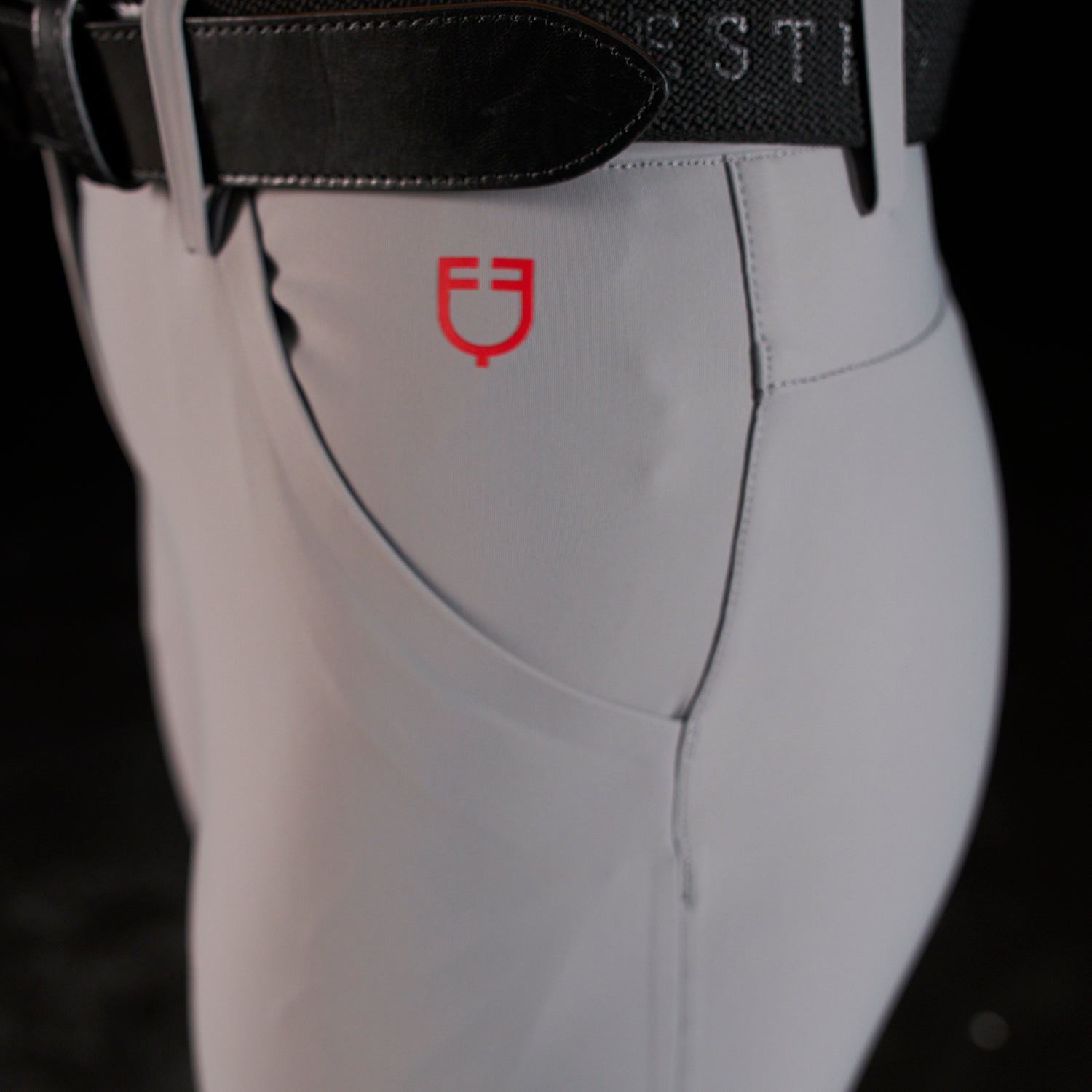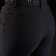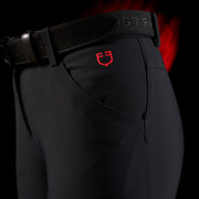 Il principale elemento distintivo di questi pantaloni è il full grip a pois in silicone posizionato sulla parte interna del ginocchio, garantendo un'eccezionale aderenza alla sella. Il grip è realizzato in tonalità tono su tono, enfatizzando il vivace rosso distintivo del logo Equestro Ridertechnology. Questo capo presenta anche due tasche anteriori e una tasca laterale elastica per una maggiore praticità. L'estetica è arricchita dalla presenza del logo Equestro e dalla scritta Equestro Ridertechnology sia sul passante della cintura anteriore che sulla tasca anteriore.