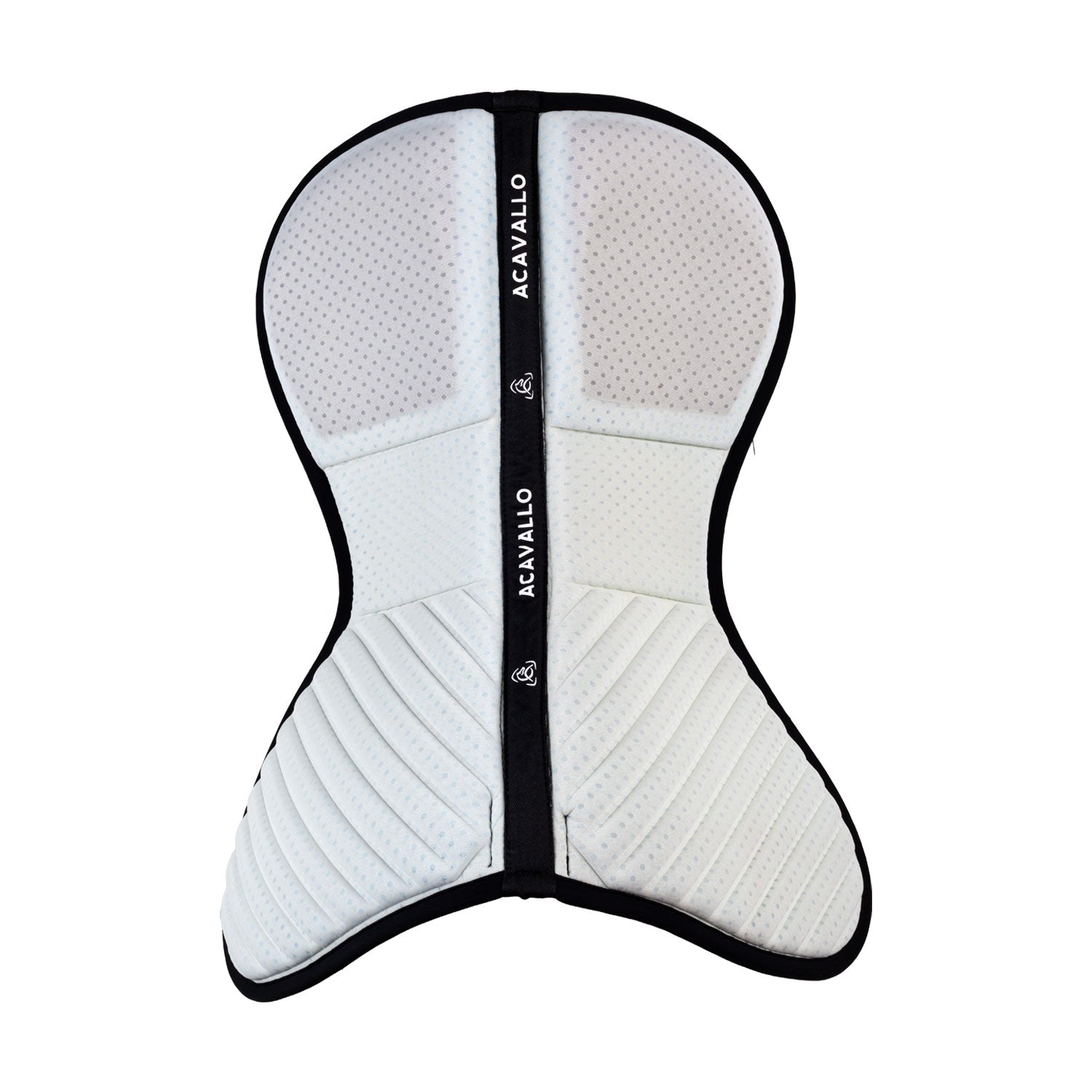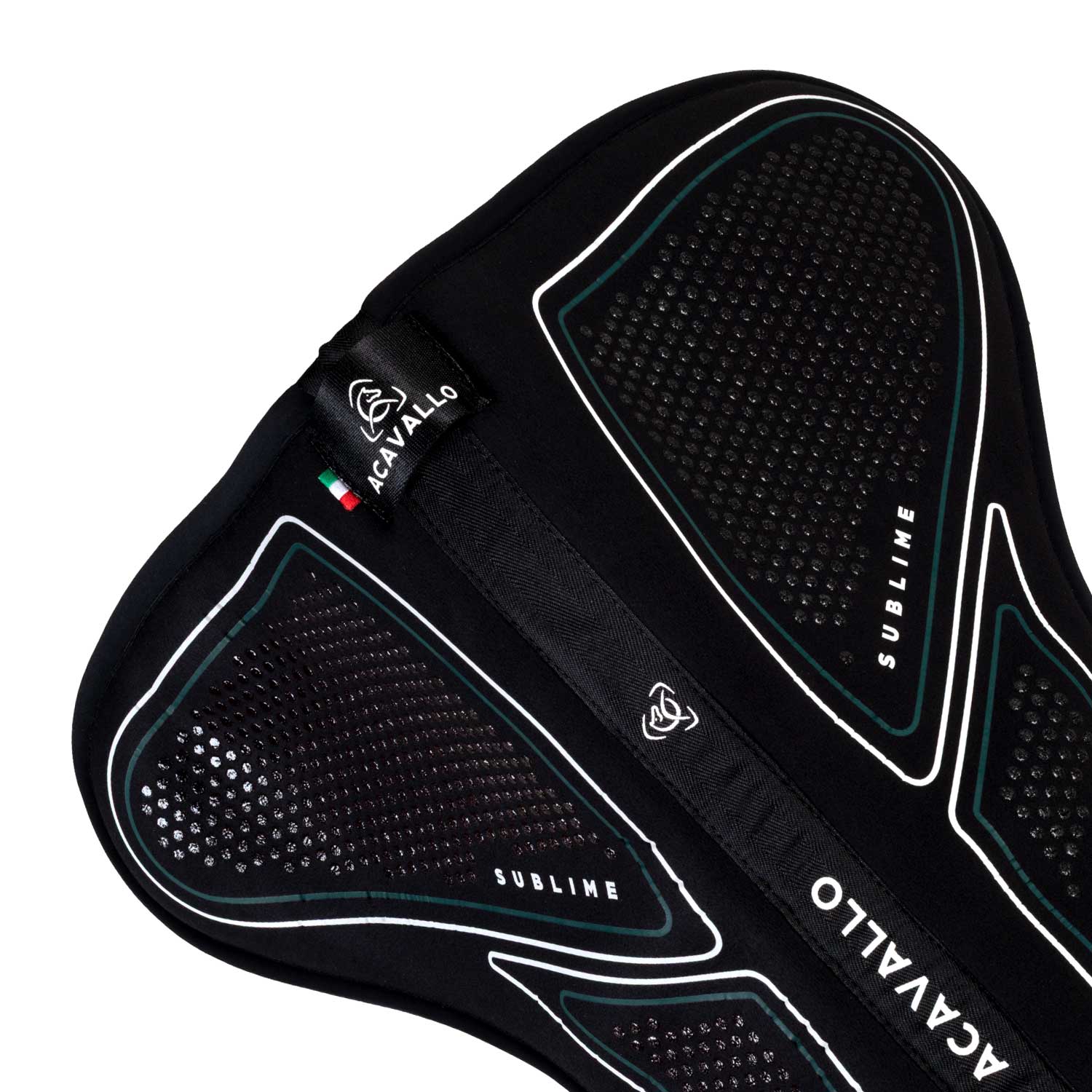 La superficie è traforata con fori e strisce ergonomiche per favorire la massima traspirabilità, mentre gli inserti in silicone garantiscono una stabilità antiscivolo tra compensatore e sella, anche durante l'attività intensa.