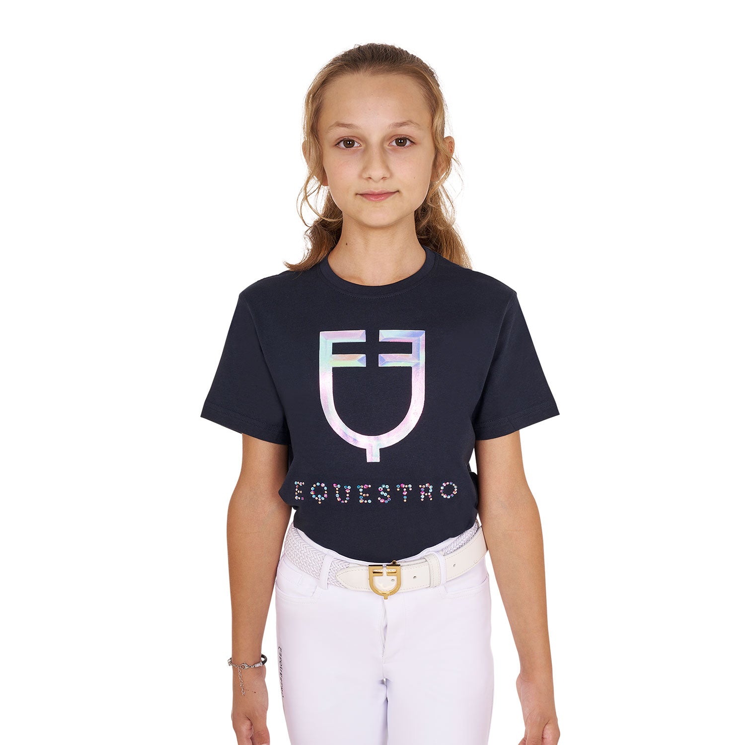 Questa T-shirt è inoltre impreziosita da una stampa raffigurante il logo Equestro e diamanti multicolor.
