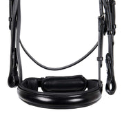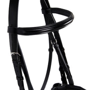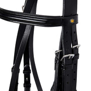 Briglia da dressage in morbido cuoio italiano, con fibbie in acciaio inox che gli conferiscono resistenza e stabilità per tutta la durata di utilizzo.