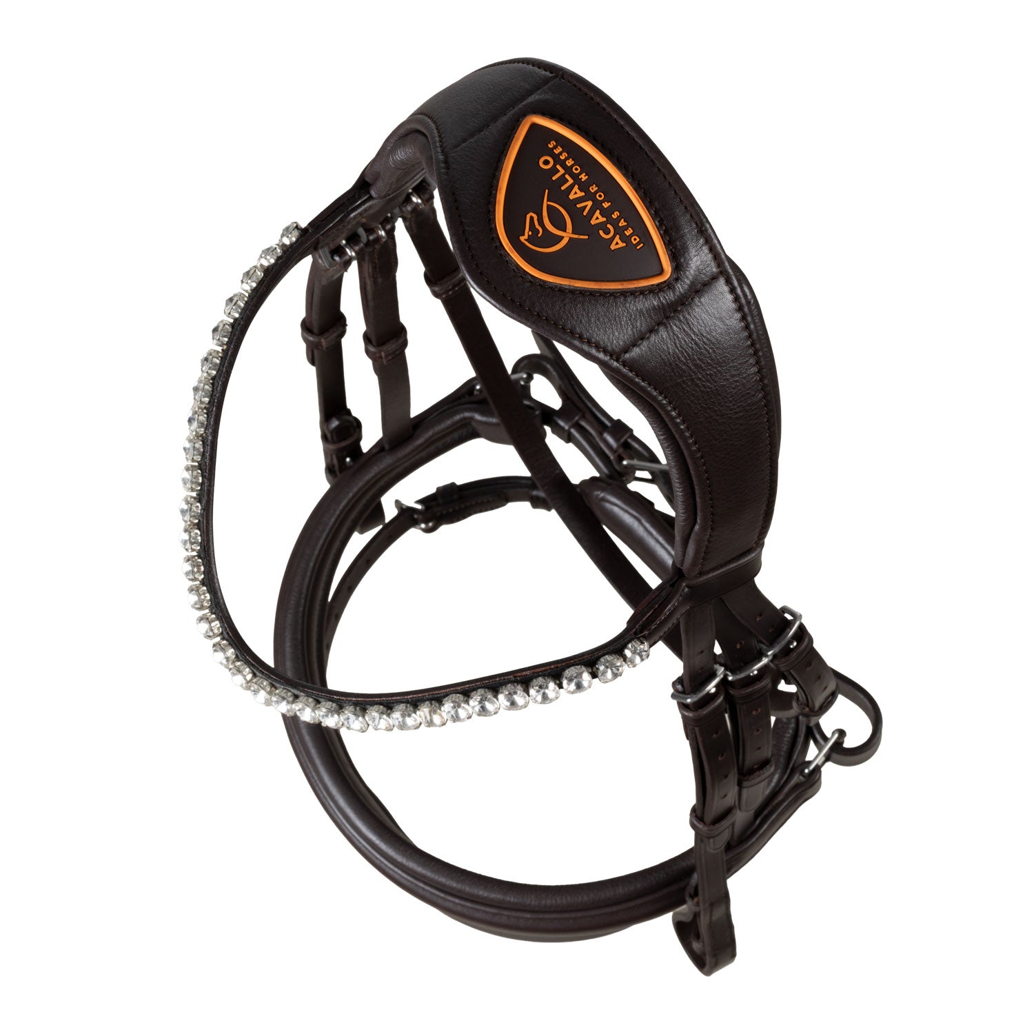Il frontalino è un'elegante caratteristica distintiva, ricoperto di brillanti, che conferiscono alla testiera un design raffinato e luccicante, tipico dei prodotti Acavallo.