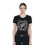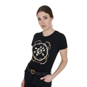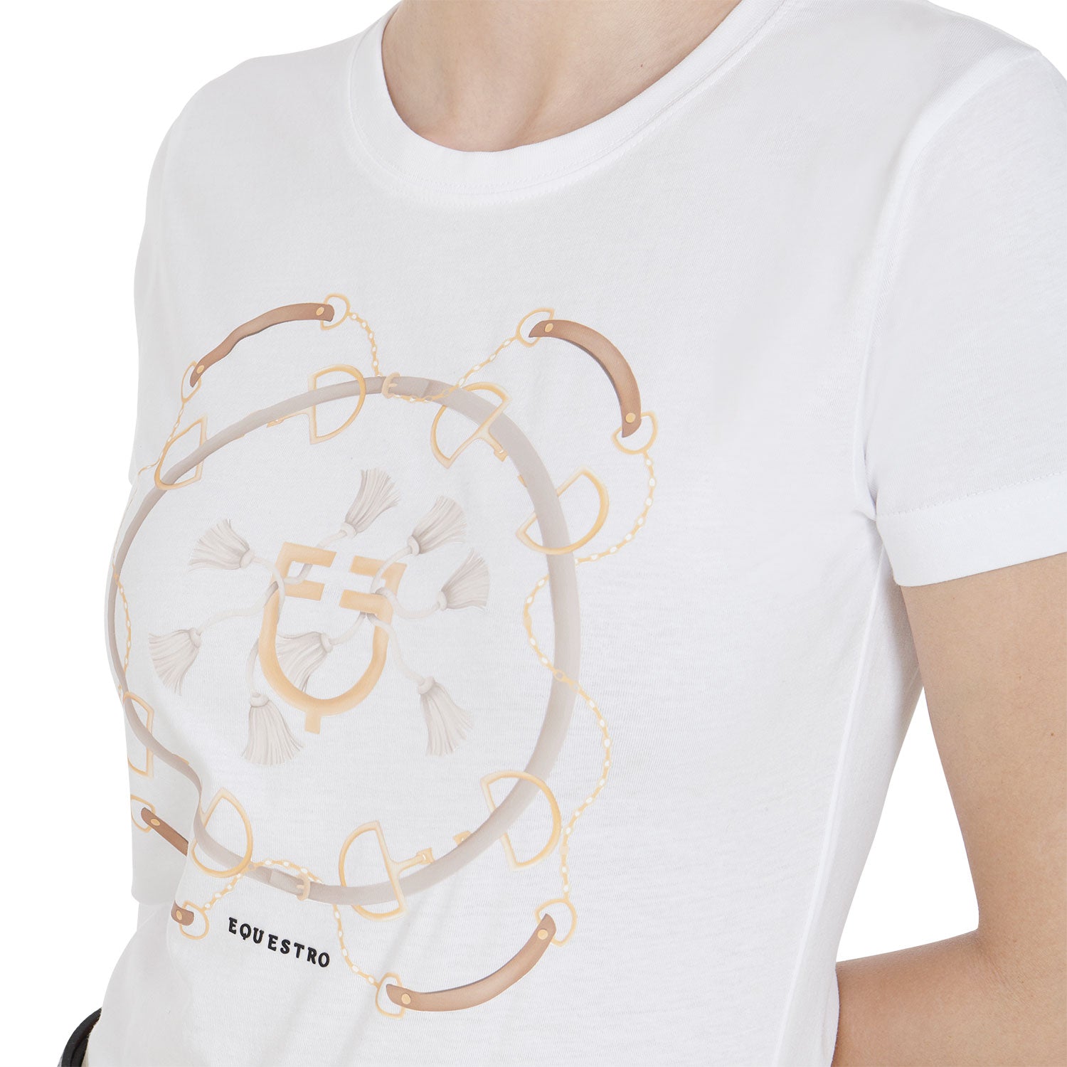 T-shirt donna slim fit in cotone, a mezza manica, decorata con la stampa di imboccature da equitazione. Elastica, super confortevole.