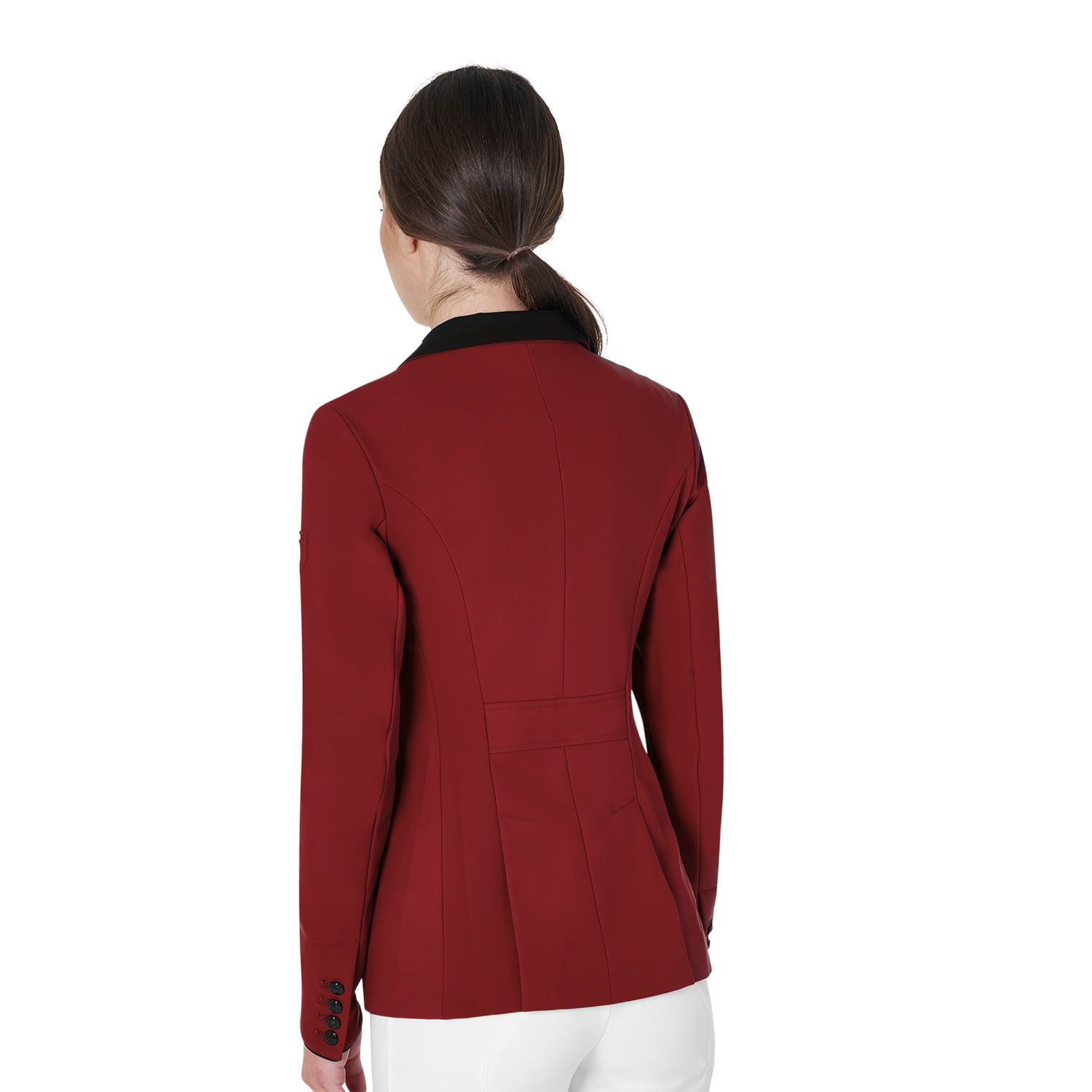 Giacca donna da concorso in tessuto tecnico traspirante e ultra leggero di ottima qualità. Tre bottoni, tasche a soffietto e patch con logo Equestro sulla spalla.