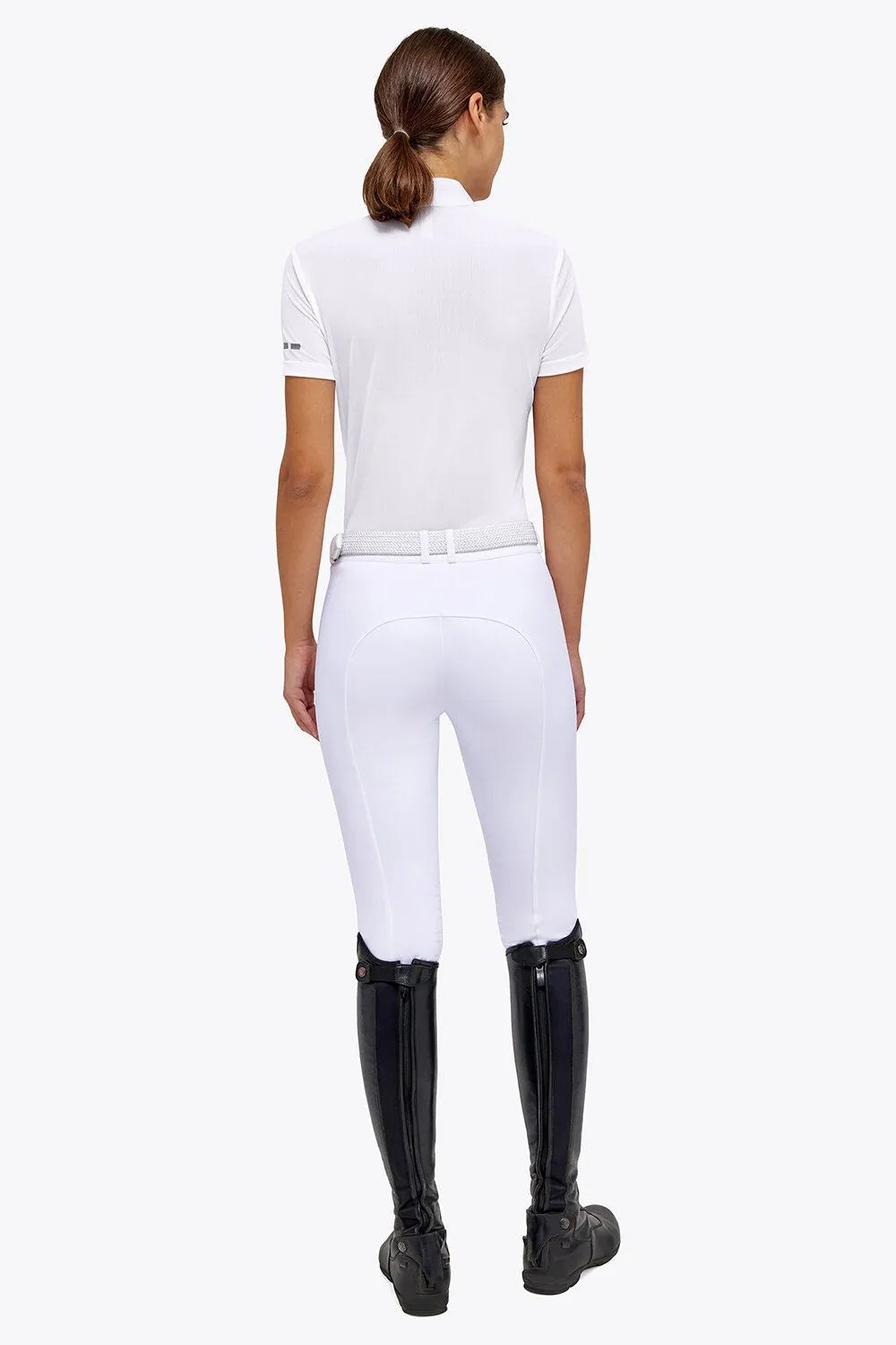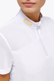 Polo da competizione donna a manica corta.Ideale per tutte le amazzoni. Realizzata in piquè di Jersey tecnico elasticizzato con inserti in mesh che conferiscono maggiore traspirabilità.Collo in popeline con dettaglio logo gommato e zip sul collo, per unire design e comfort.