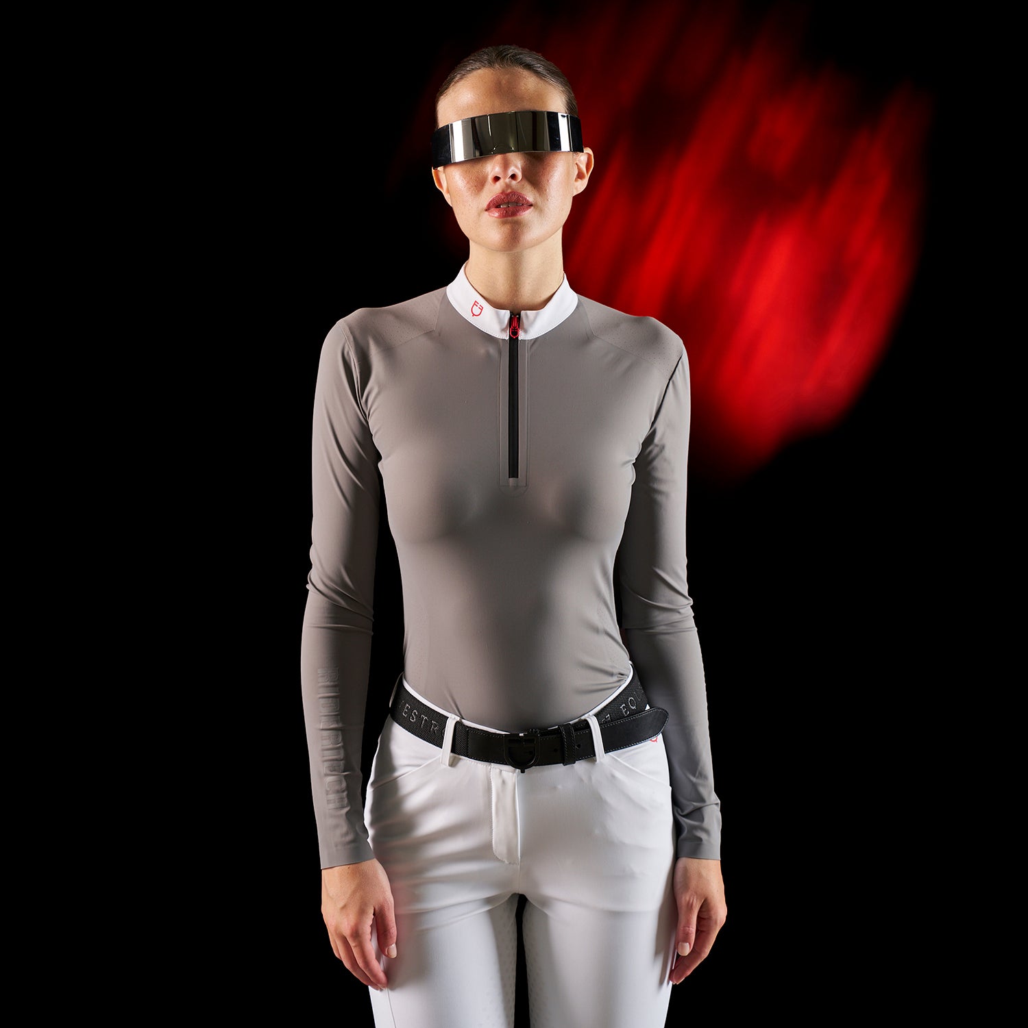 La polo è caratterizzata dalla chiusura a zip, dal colletto minimal e dalla scritta Equestro Ridertechnology tono su tono lungo la manica destra.