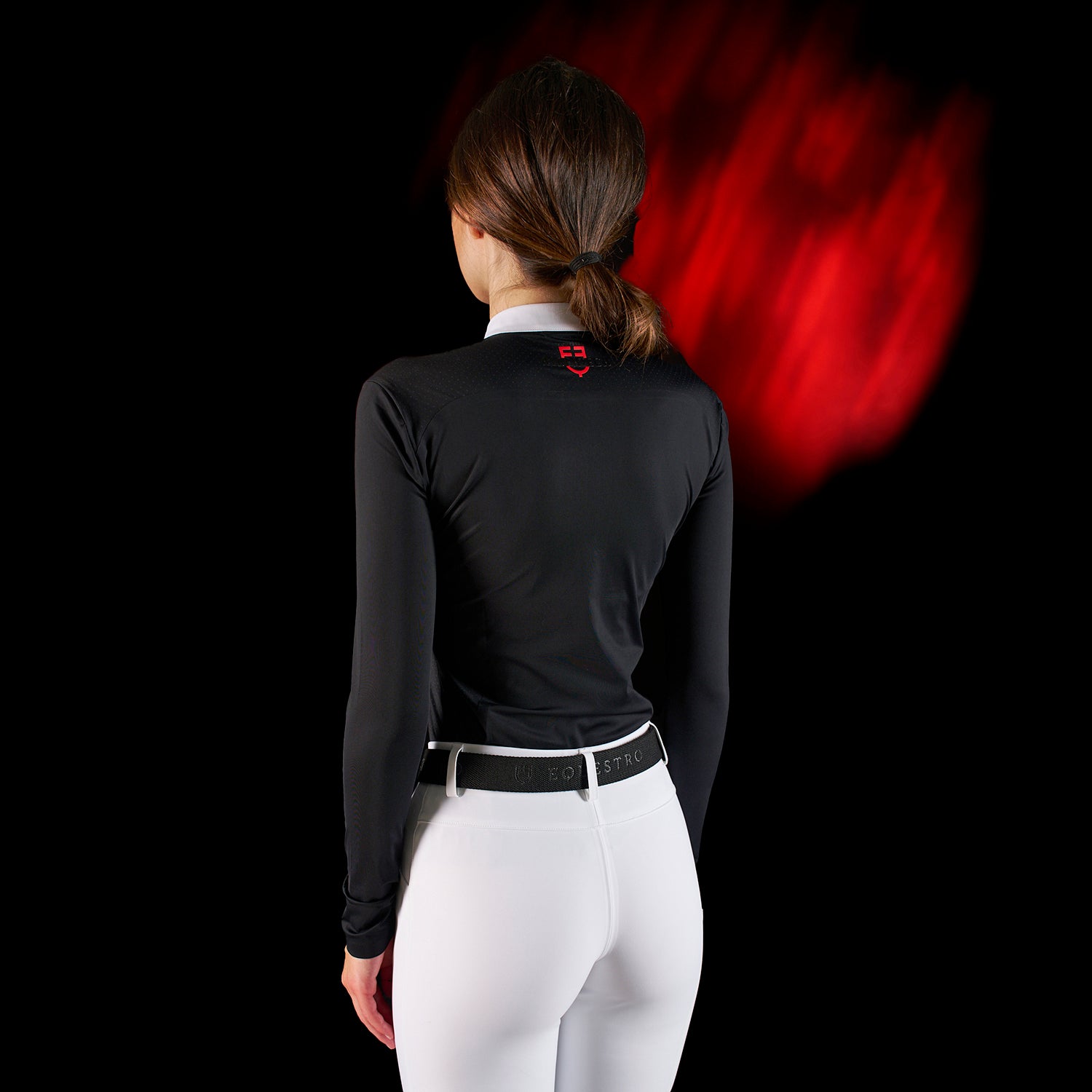 Polo donna da concorso slim fit a maniche lunghe in tessuto tecnico traspirante e con cuciture termosaldate, punto di forza della collezione Equestro Ridertechnology.