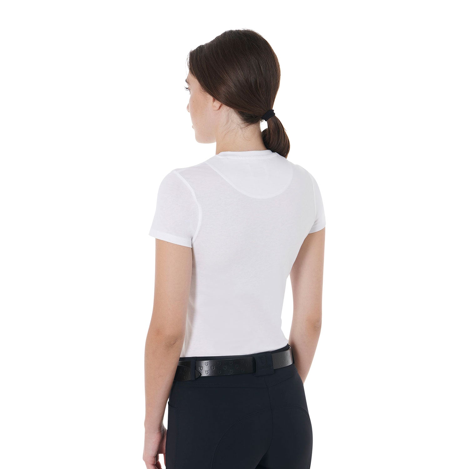 Progettata per aderire delicatamente alla silhouette femminile grazie alla sua vestibilità slim fit. Il cotone permette di assorbire l'umidità il che la rende una scelta eccellente per chiunque pratichi l'equitazione.
