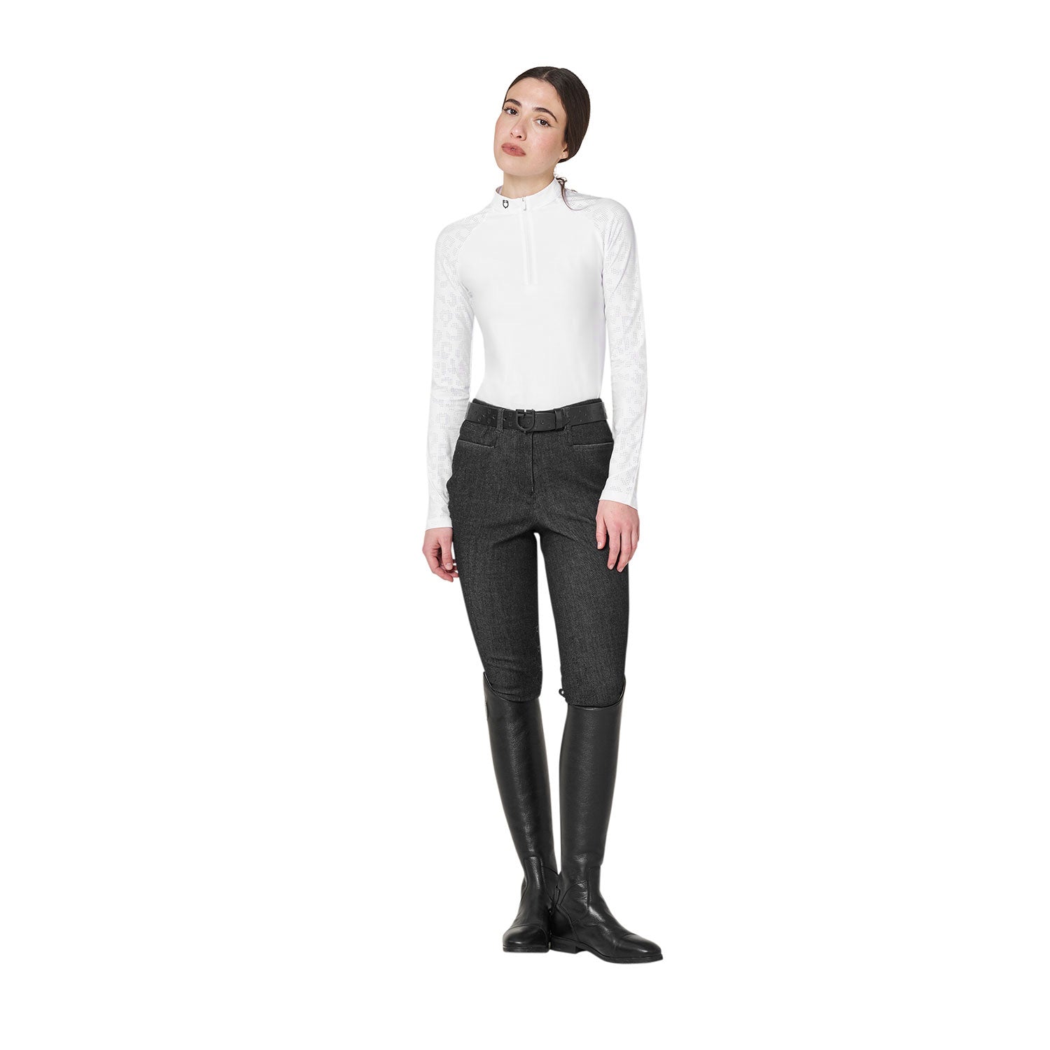 Pantaloni da donna realizzati in tessuto denim tecnico e elasticizzato, studiati per offrire comfort, resistenza e libertà di movimento durante l’attività equestre. La vestibilità equilibrata e il design pulito li rendono ideali sia per l’allenamento che per l’uso quotidiano in maneggio.