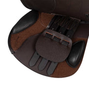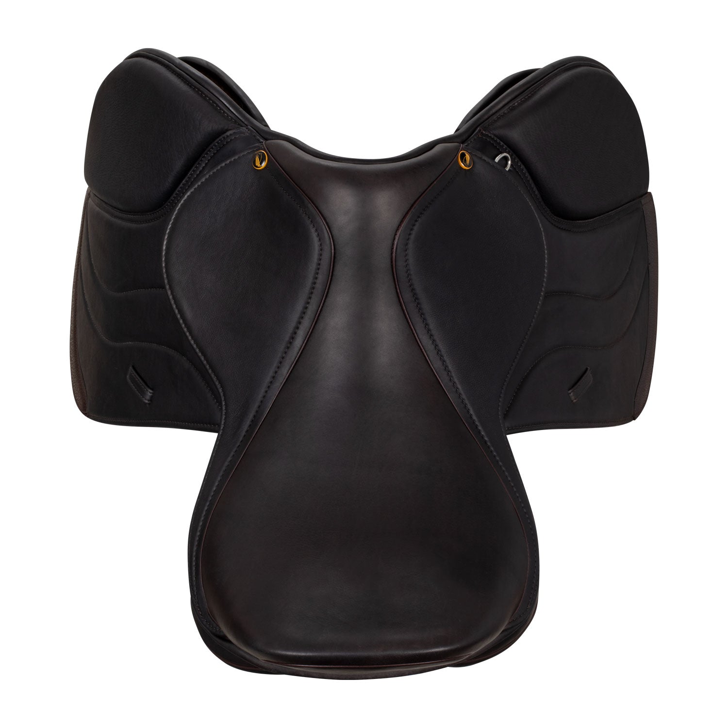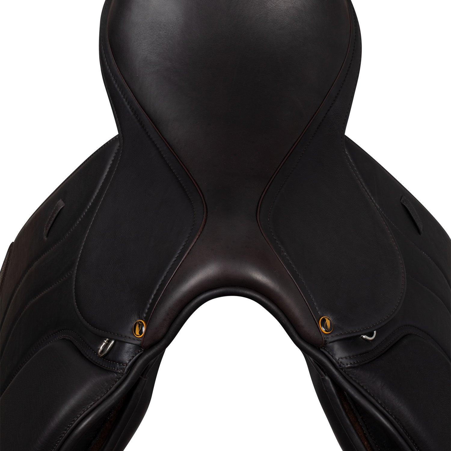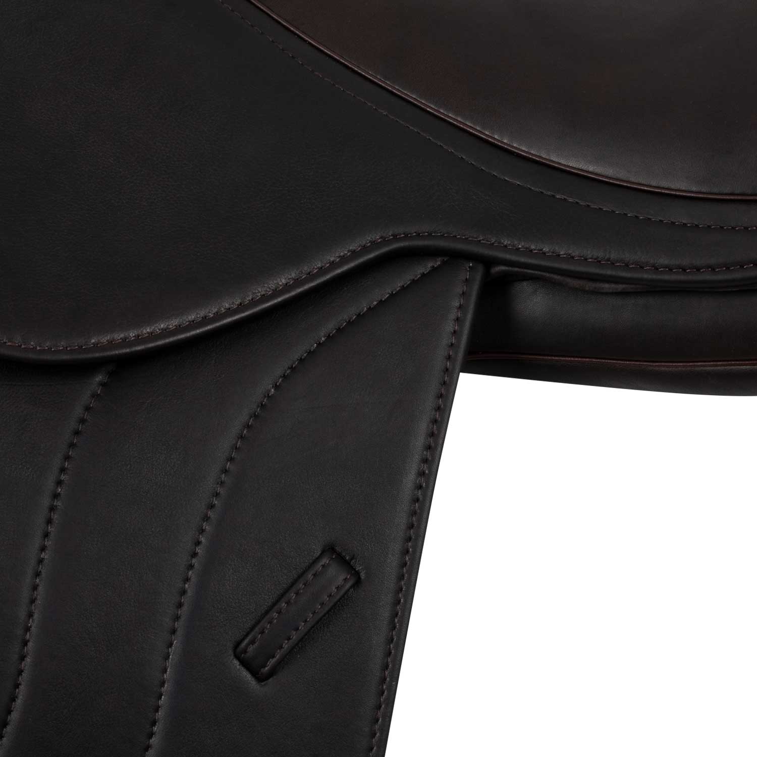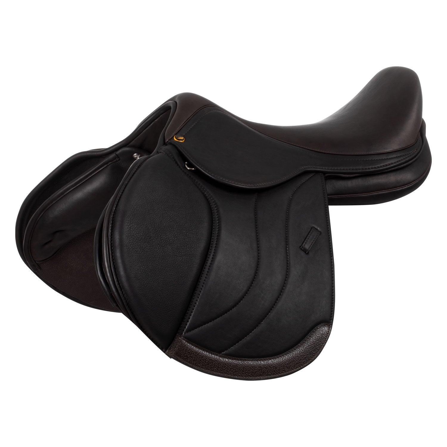 Sella da salto realizzata in morbido cuoio doppiato di alta qualità con archetto intercambiabile, progettata per offrire il miglior close contact senza bloccare i movimenti del cavallo.