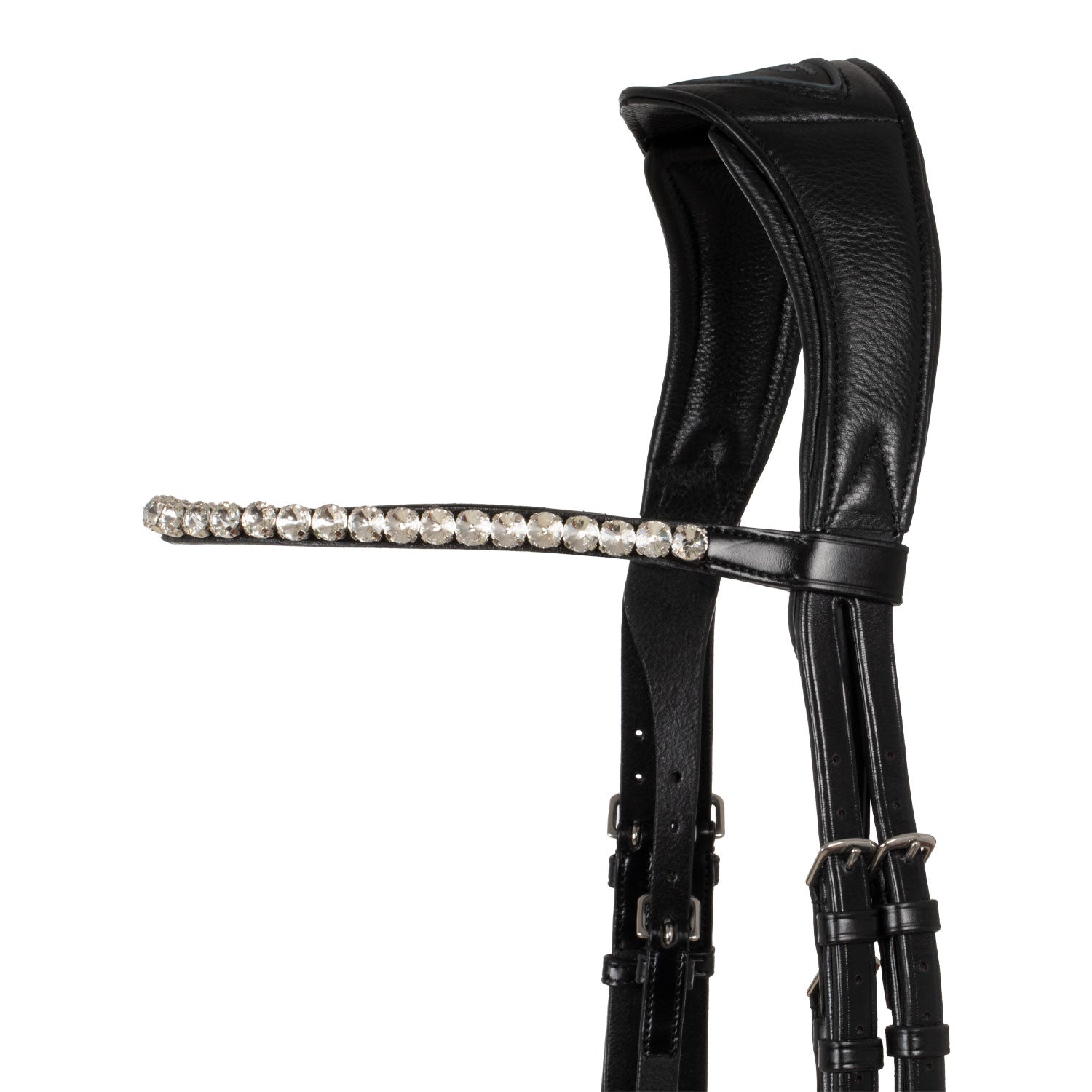 Il frontalino è un'elegante caratteristica distintiva, ricoperto di brillanti, che conferiscono alla testiera un design raffinato e luccicante, tipico dei prodotti Acavallo.