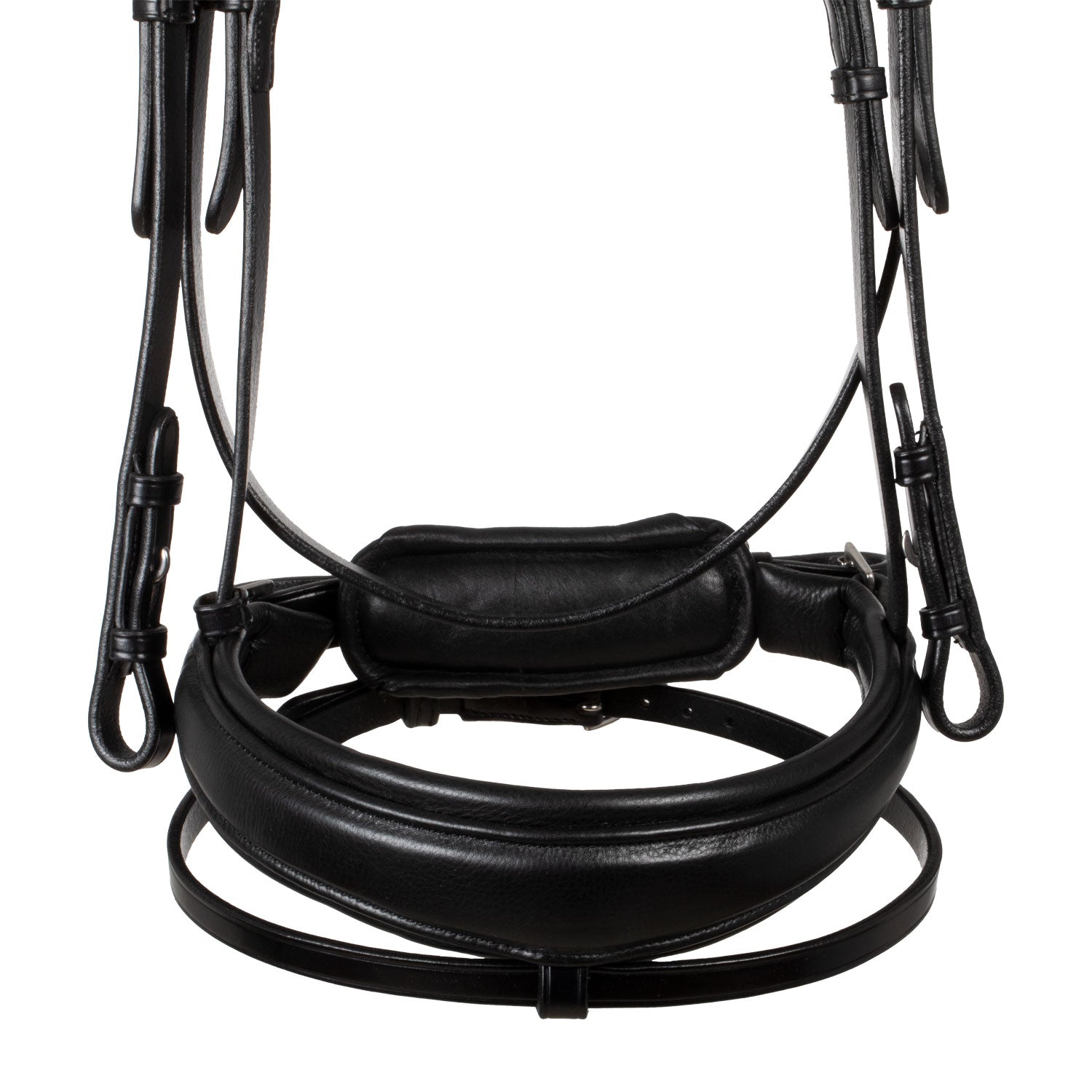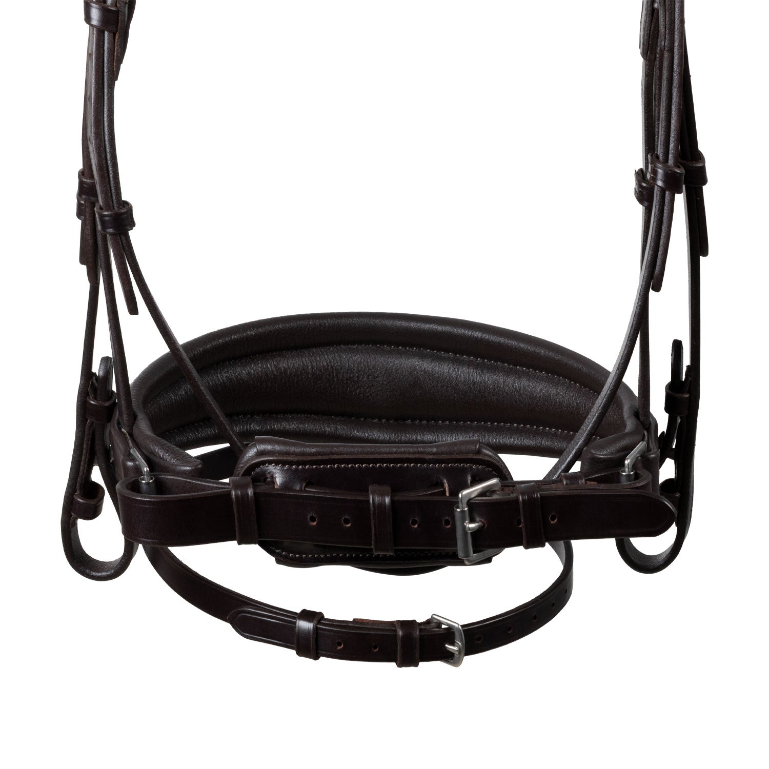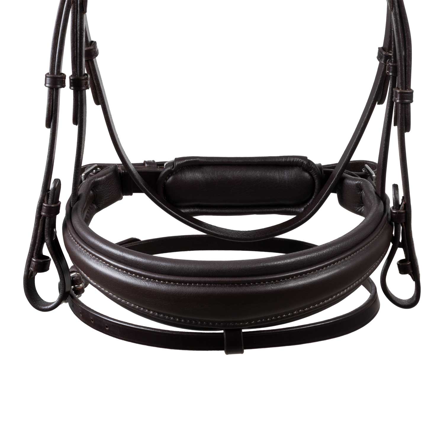 Il sovracapo sagomato e anatomico presenta due imbottiture laterali in lattice, lasciando libera la parte centrale per alleviare la pressione nella zona del cranio del cavallo. Questo design mette il benessere del cavallo al primo posto, assicurando una vestibilità comoda e senza restrizioni.