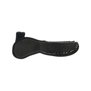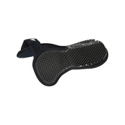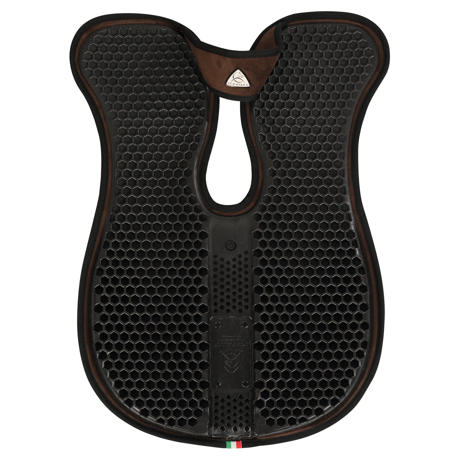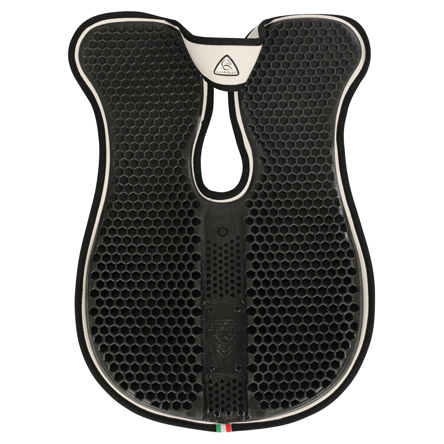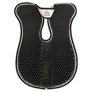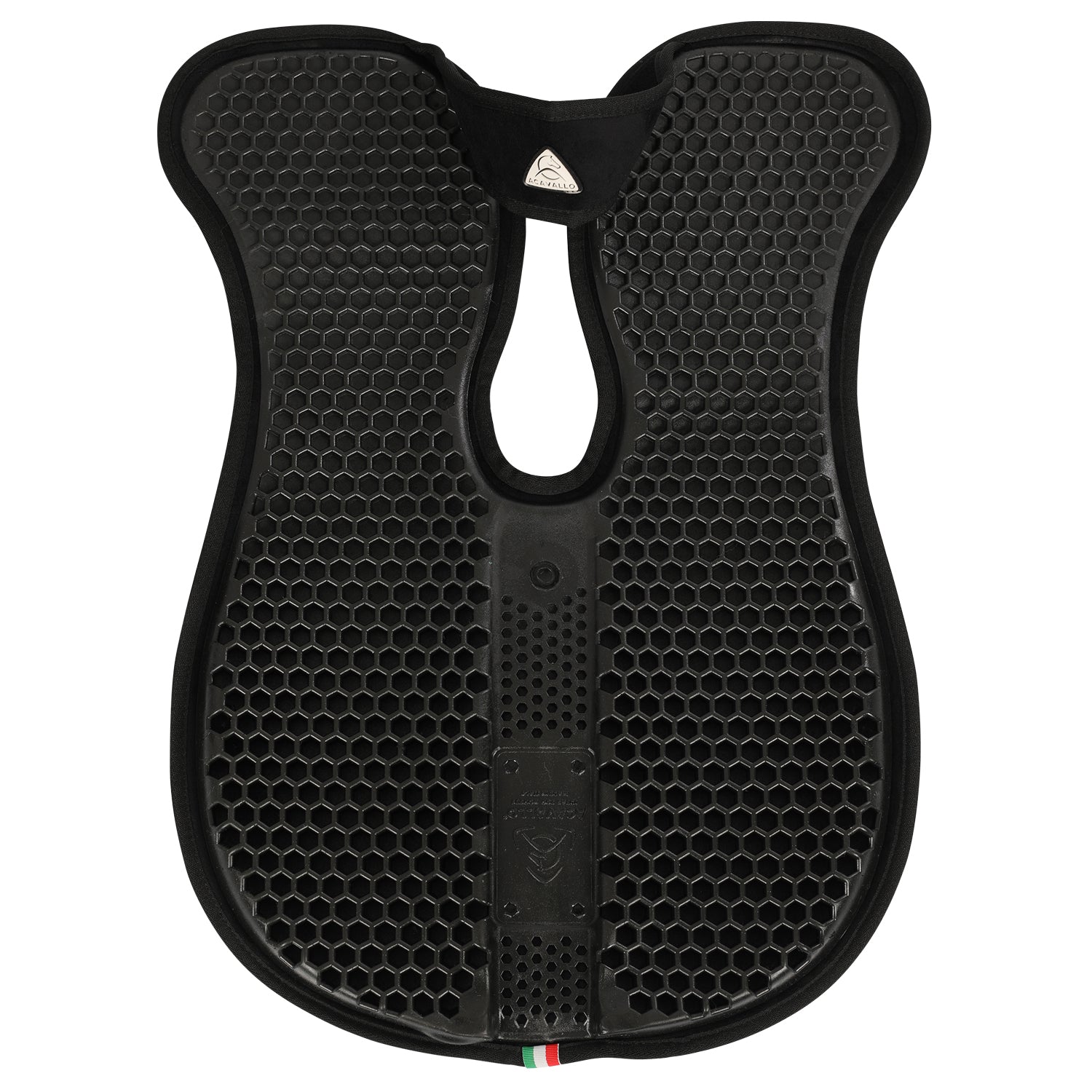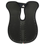 Il gel, antiscivolo, ammortizzante e a forma esagonale di questo compensatore, combinato nella parte inferiore con tessuto in camoscio e con una schiuma interna a celle aperte di spessore 4mm, lo rendono traspirante, mantenendo al contempo il massimo comfort sulla schiena del cavallo.