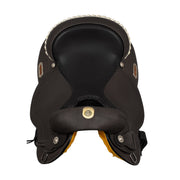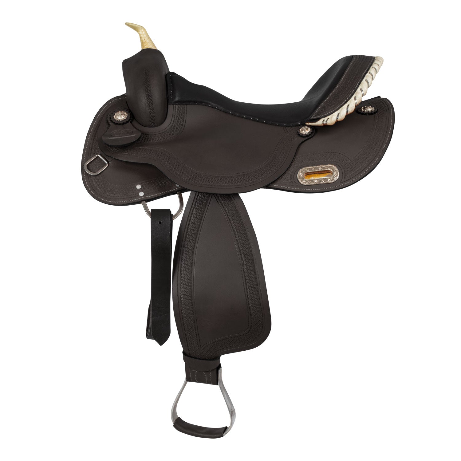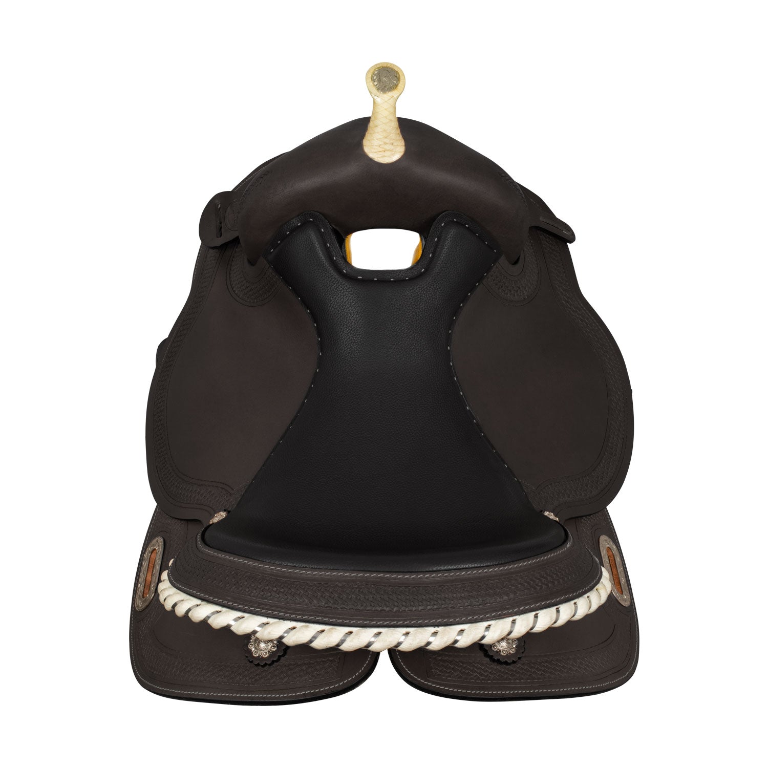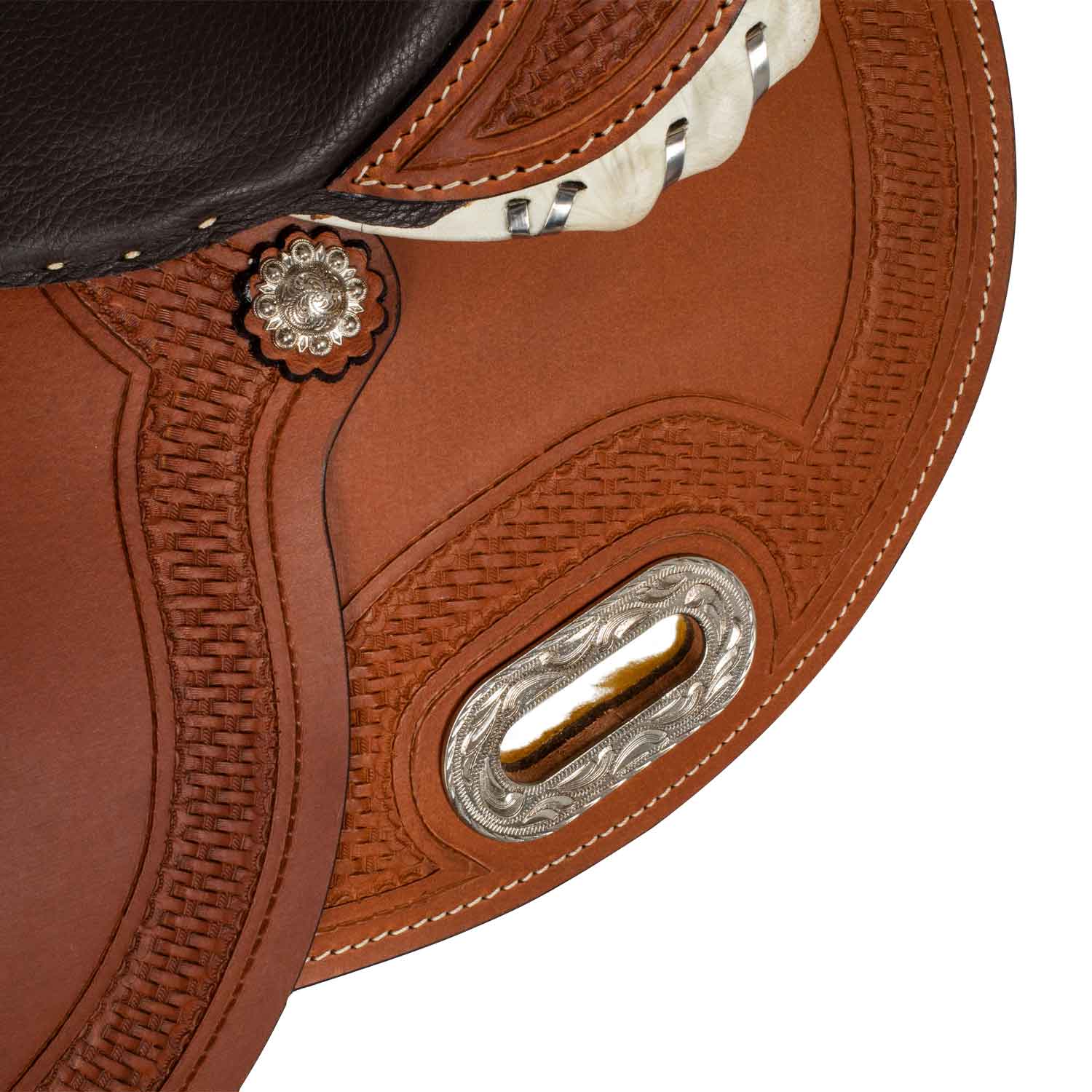 Sella western da barrel realizzata in cuoio di alta qualità, riporti in rawhide, seggio in pelle e arcione in Ralide.